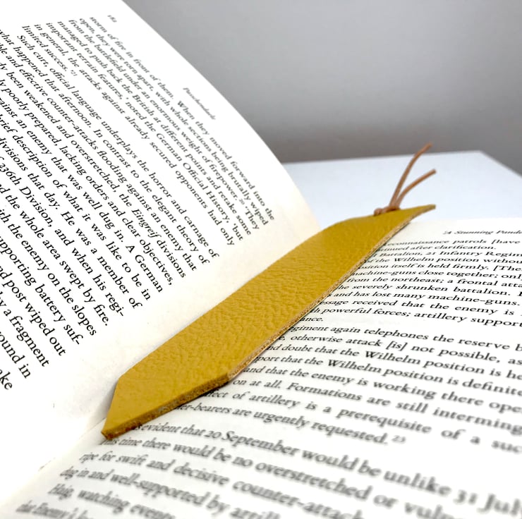A gorgeous yellow leather bookmark with a lovely pale green floral fabric lining and a light brown suede tail.