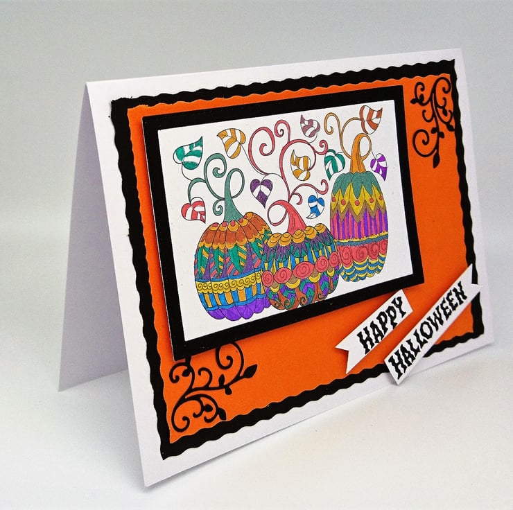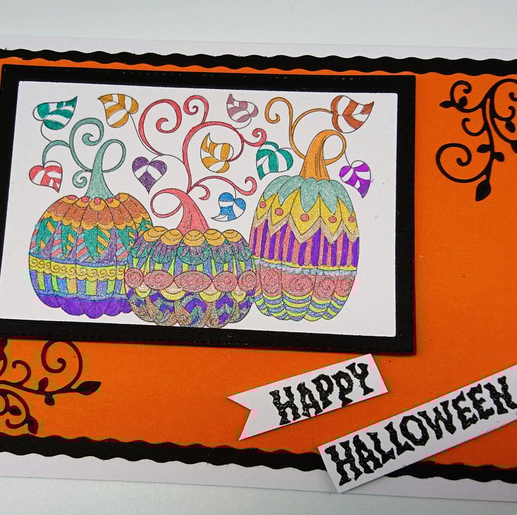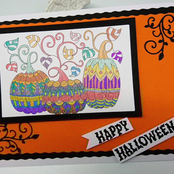 Happy Halloween Card. Three abstract pumpkins hand coloured with glitzy pens, framed in black and raised onto layers of orange and black on a 5" x 7" quality white card. Decorated with black swirls and "Happy Halloween" sentiment in scary font. Handmade with love In my wee studio in Scotland.