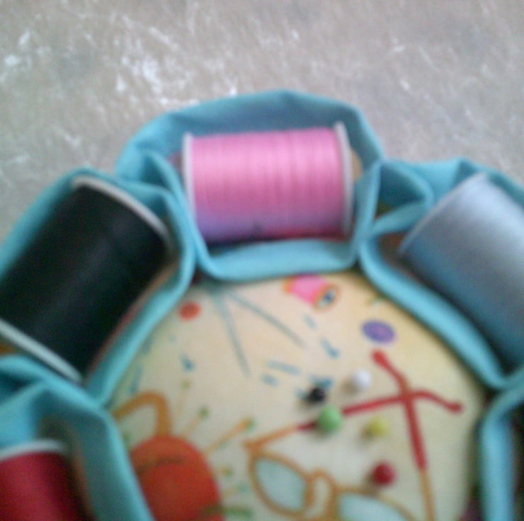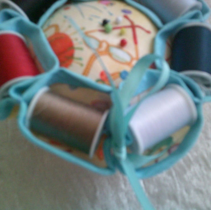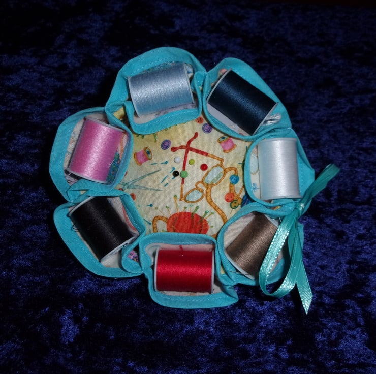 This handy Pin Cushion comes complete with seven reels of cotton including Black and White and a few pins. The design features scissors, glasses and pins on a cream background with Blue Bias Binding. Ideal to be given as a table present or for someone off to university.