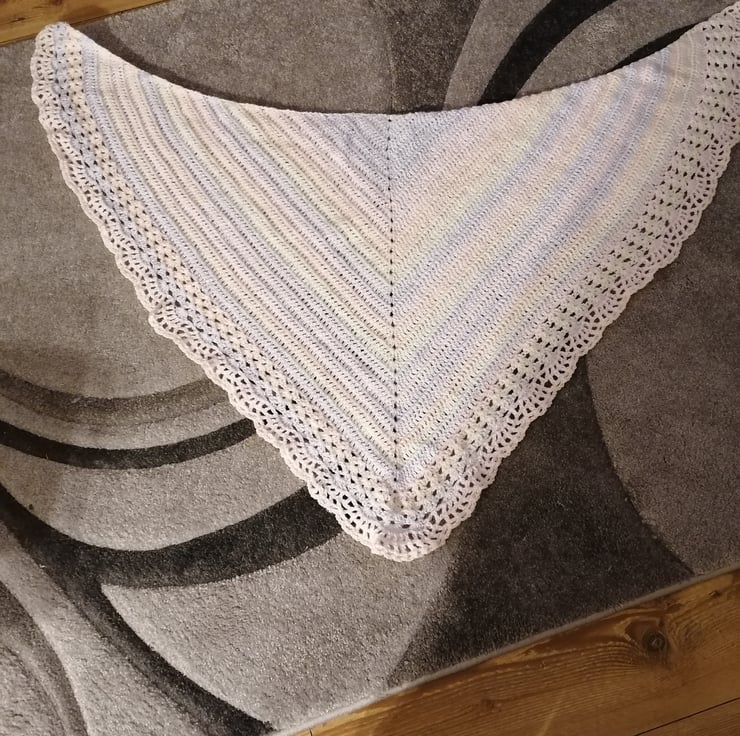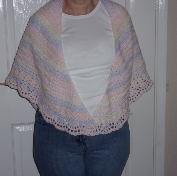 This crocheted shawl is ideal for chilly evenings in both the Summer and Winter. It is crocheted in an acrylic yarn of pastel colours including cream, lavender and pink. It features a lacey bottom edge.