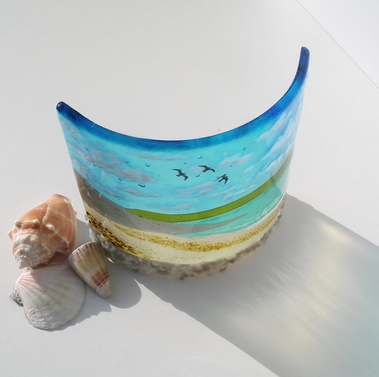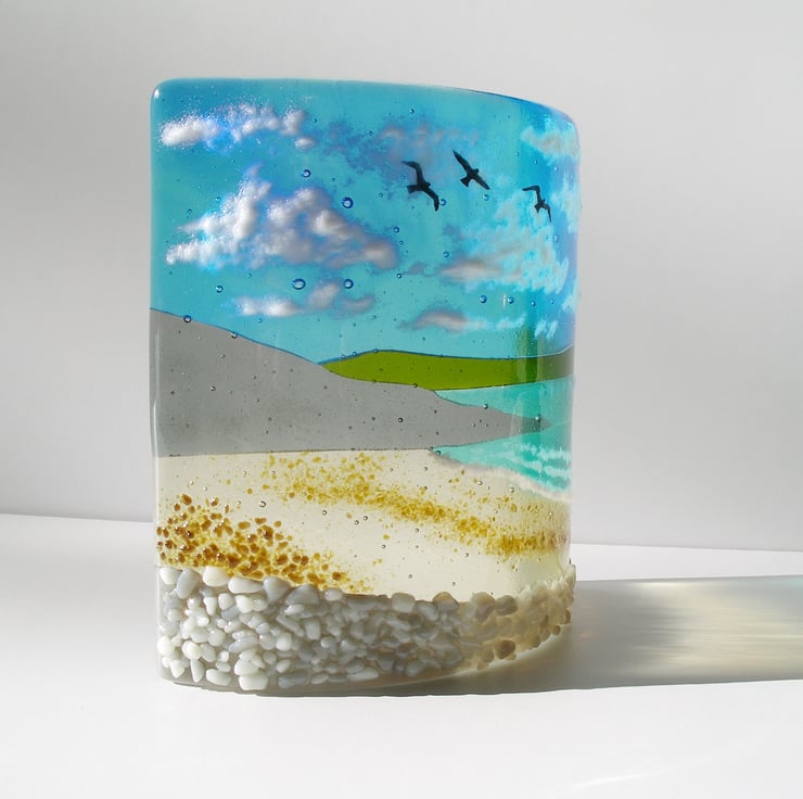 It is made from a combination of smooth and tactile textured glass to give it a sculptural feel, and comes in glorious aqua and turquoise colours which really glow in the light. No seaside scene would be complete without gulls so I have hand-painted a few to add an element of life.
