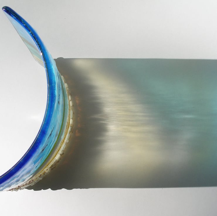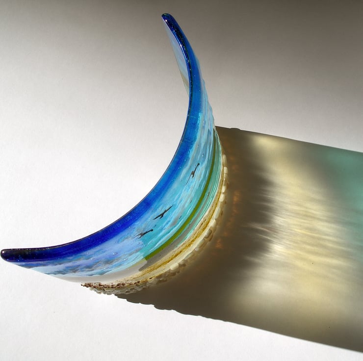 The Southerndown curve is my attempt to capture this popular beach along the Glamorgan Heritage Coast, near my home in South Wales. It is a very familiar sight having visited it regularly throughout my life, and on most days, you can see the coast of Somerset in the distance. As a keen walker, the fabulous scenery along this Jurassic coastline with its dramatic cliffs provides lots of inspiration for fused glass pieces. I snap away on my phone as I walk, capturing scenes which I later use back in my workshop.