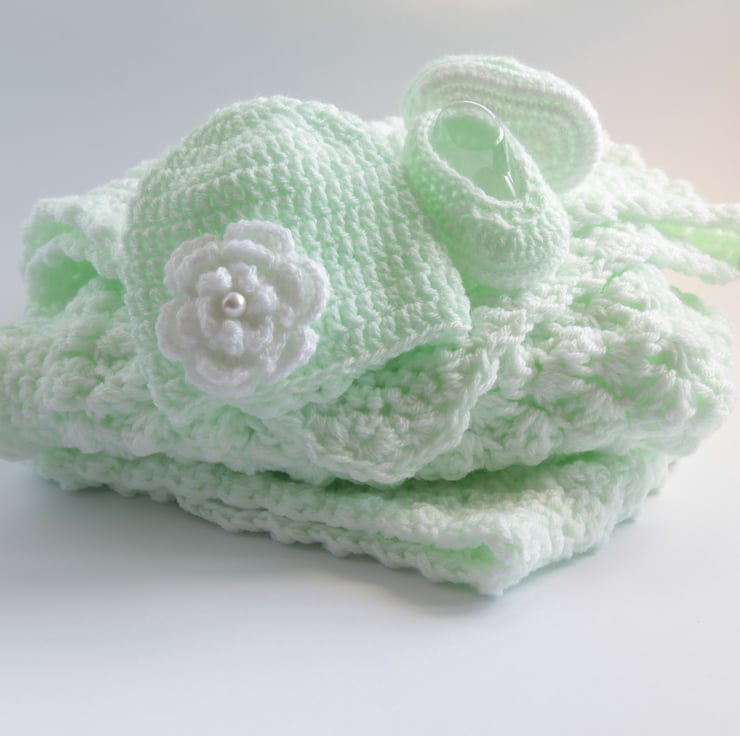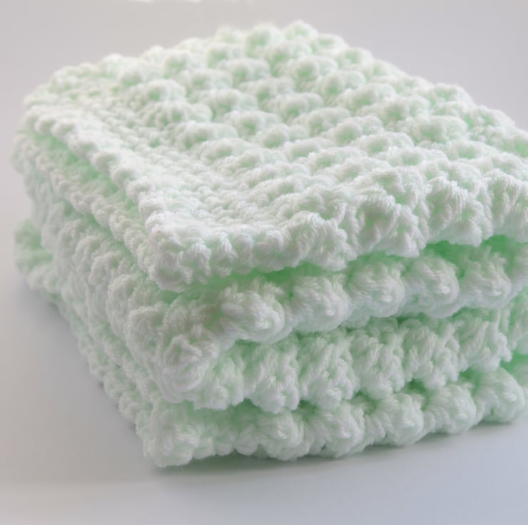 Blanket is made crocheting two strands together, this one is mint green and white, measuring approx 24" x 32"