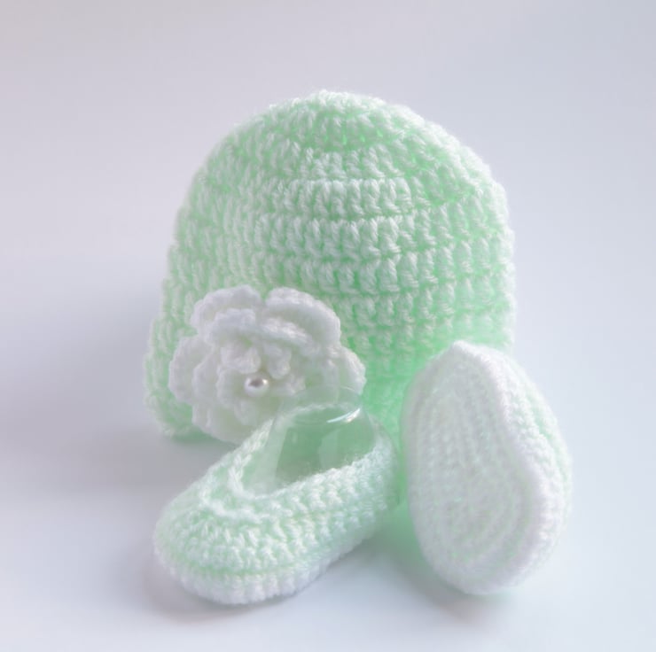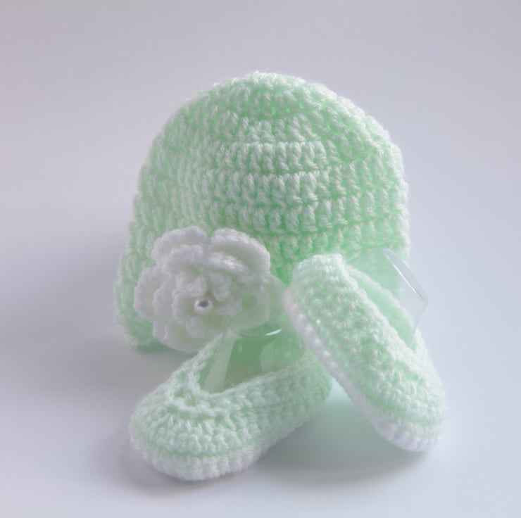 The shoes are green with a white sole, both hat and shoes are for age 0 - 3 months