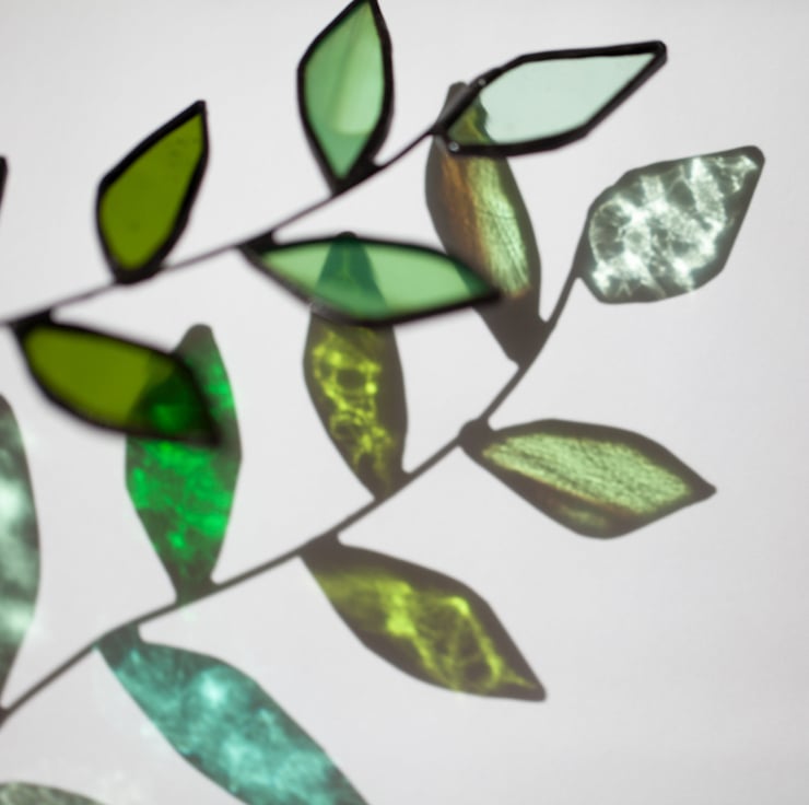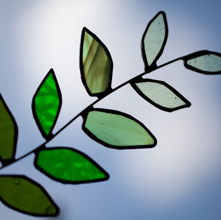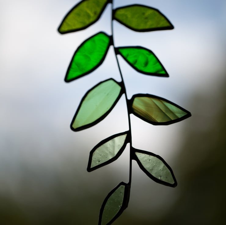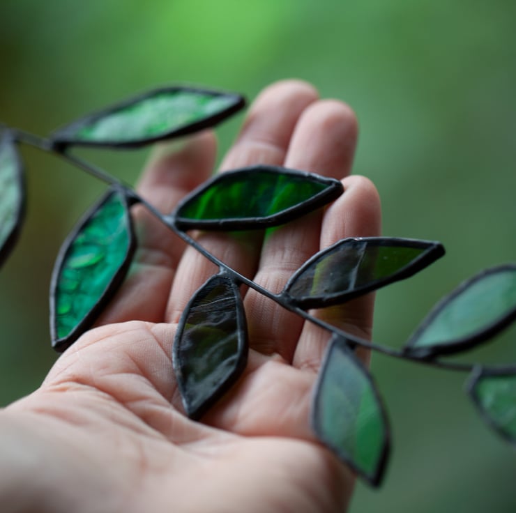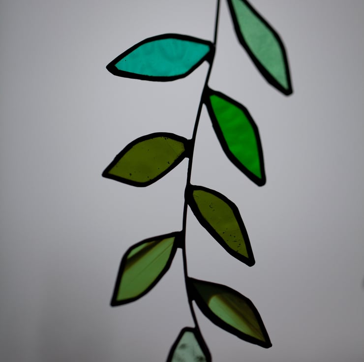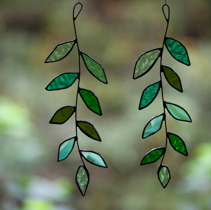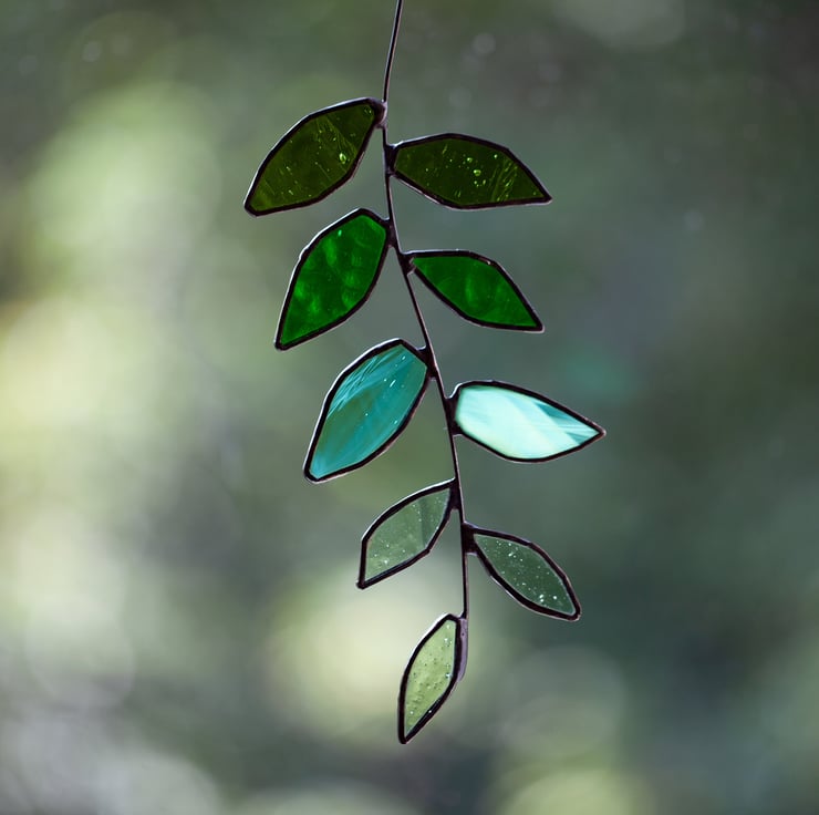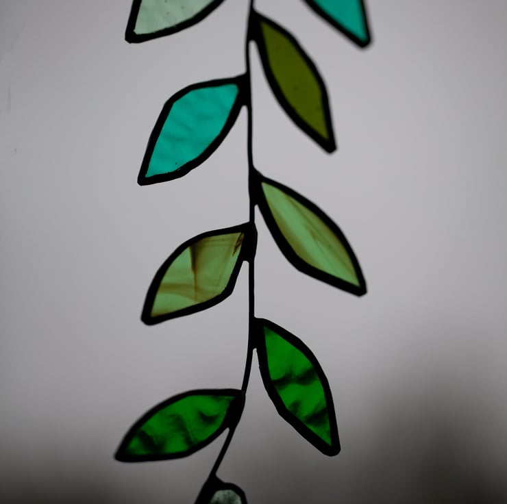 This stained glass ornament has been made from different shades of green glass using the Tiffany technique. Some of the glass has lovely texture. Colours and their order on the vine may vary slightly from pictured ones. It is finished in black patina and polished. It looks lovely hung on the window or can be used as a beautiful wall hanging. It can be used as a suncatcher for the window, as a decoration for the wall or you can put it on windowsill. Size varies too a little bit - no two leaves are alike! Length is between 22-24cm and leaf is 8cm wide approx.