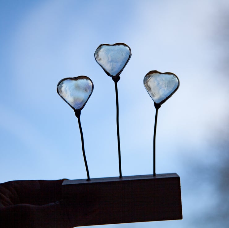 This stained glass ornament has been made of glass nuggets using the Tiffany technique. It is finished in black patina and set in piece of wood. It looks lovely on window sill or on the desk.
