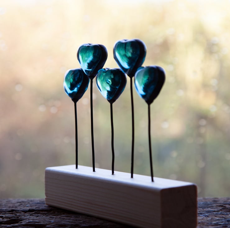 This stained glass ornament has been made of blue glass nuggets using the Tiffany technique. It is finished in black patina and set in piece of wood. It looks lovely on window sill or on the desk.