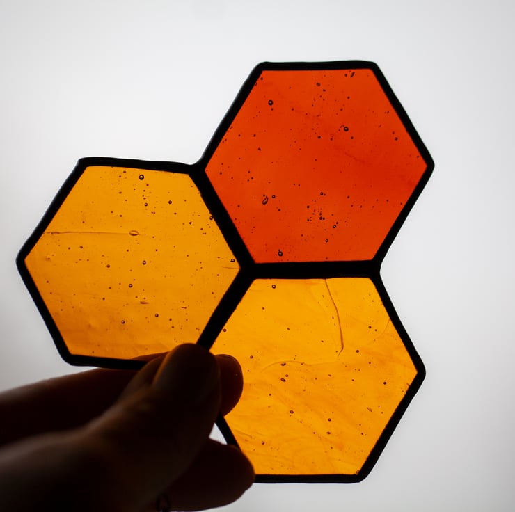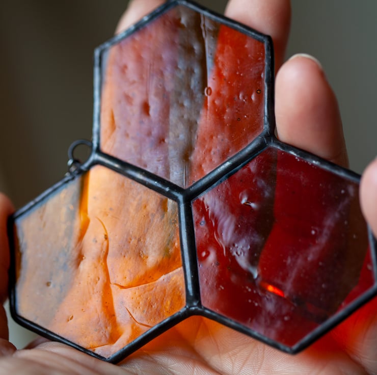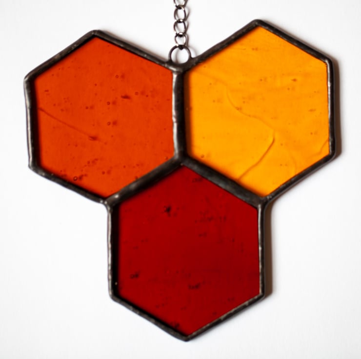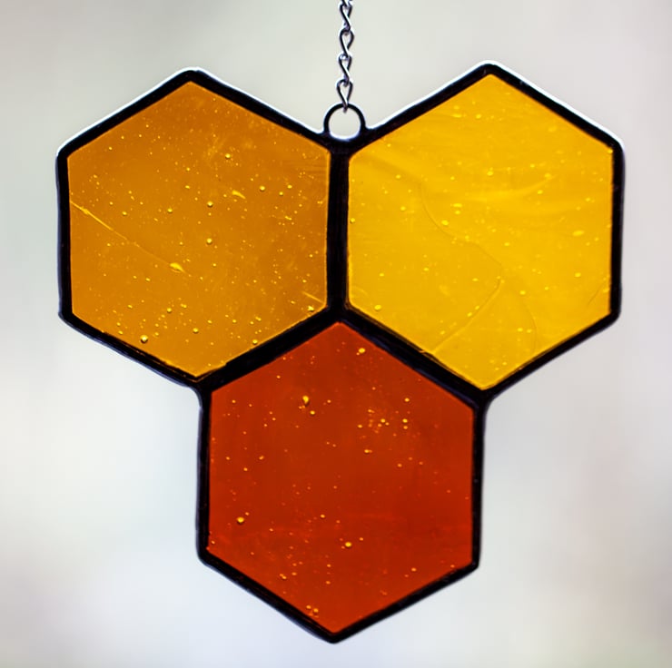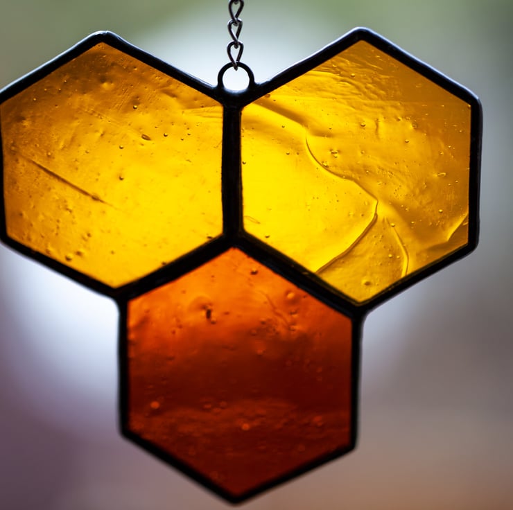 A beautiful honeycomb suncatcher. Made with traditional Tiffany technique. To create this Ive used three tones of amber colour stained glass, metal chain, lead solder, tinned copper wire and copper foil. This glass have a beautiful texture and a lot of tiny air bubbles.