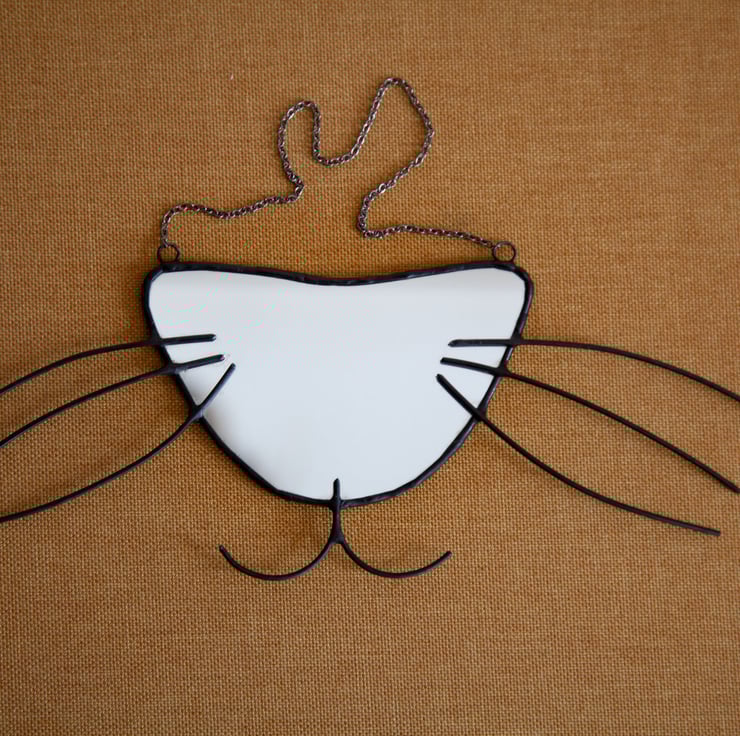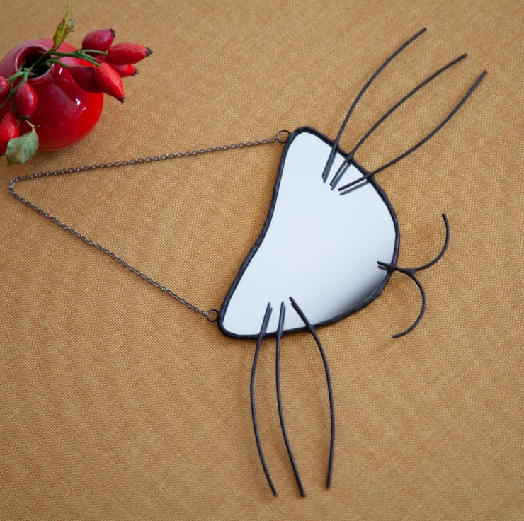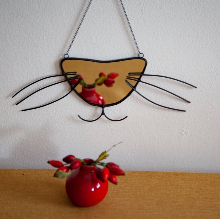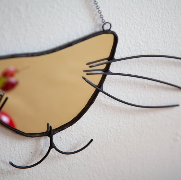 Handmade mirror picturing cat's nose and wiskers. Made of mirror and copper wire using Tiffany technique. Ideal for cats lovers!