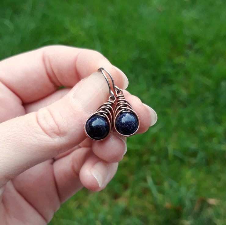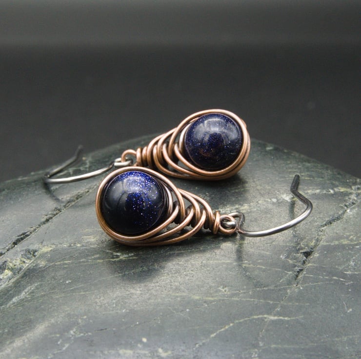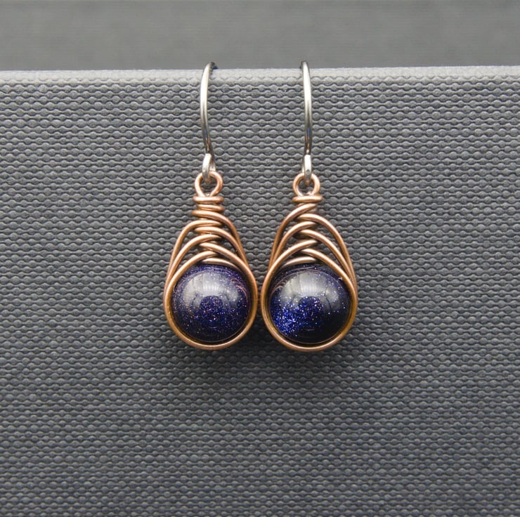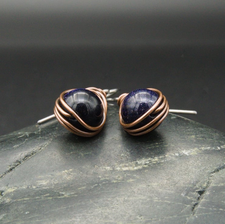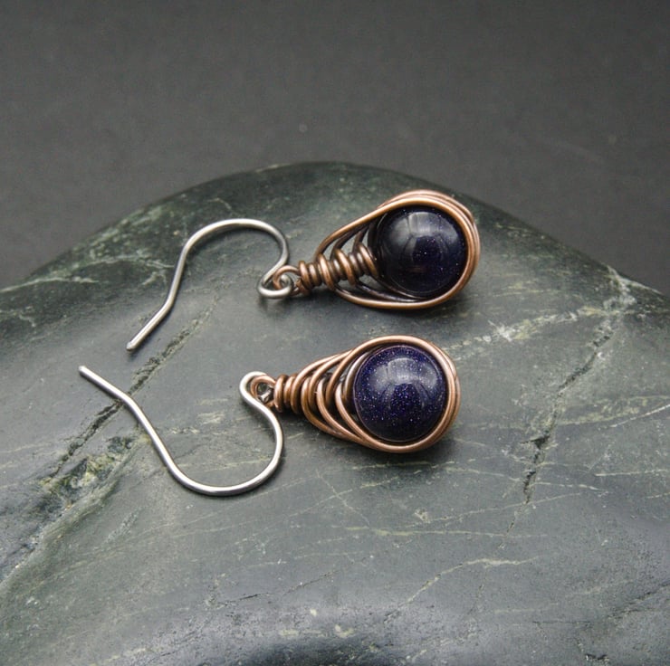 These lovely earrings feature 8mm round Blue Goldstone beads, which I have wrapped with copper wire using a herringbone weave. Blue Goldstone is a dark blue colour with metallic glittering flecks - it's not actually a stone at all, but actually man made glass with tiny pieces of copper suspended within it. It really does look beautiful wrapped in copper!
