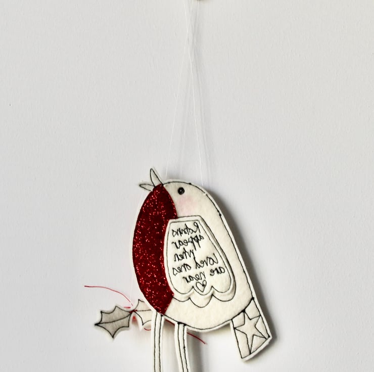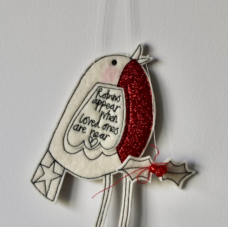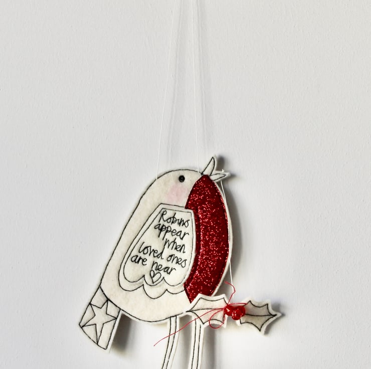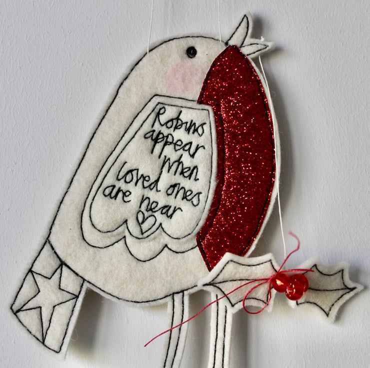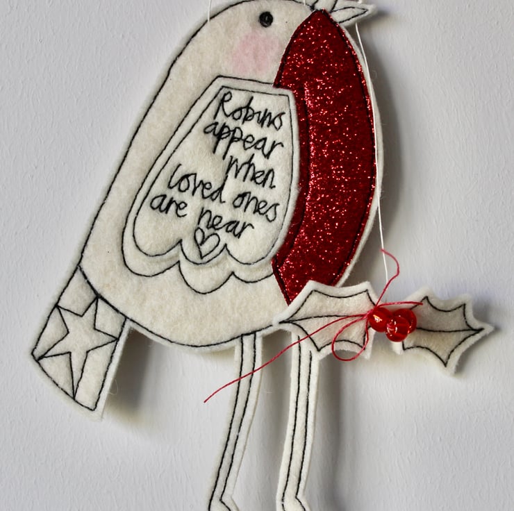 With a red glittery breast, Mr Robin has holly suspended from his beak and the sentiment 'Robins Appear when Loved Ones are Near' sewn on his wing.