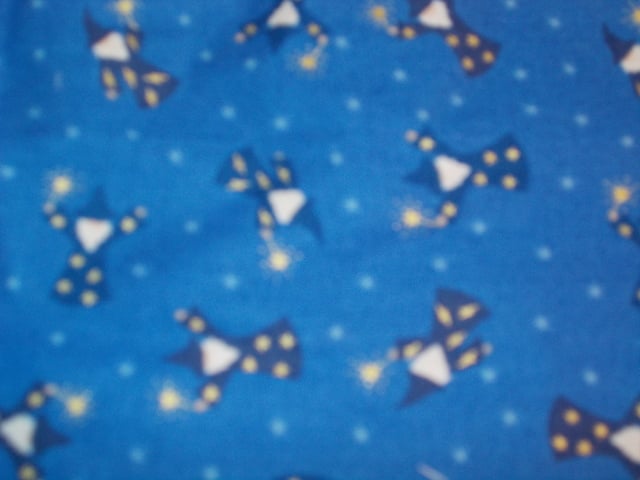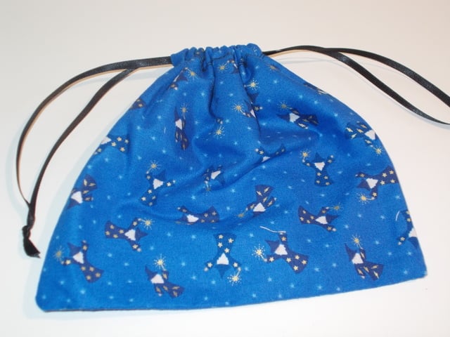 This bag is printed with small wizards. The background is blue with the wizards in dark blue The bag has a drawstring.