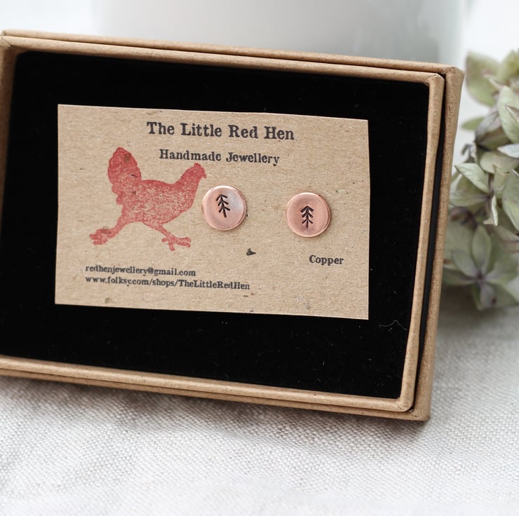 These cute little studs are cut from sheet copper and stamped with a stylised tree motif.