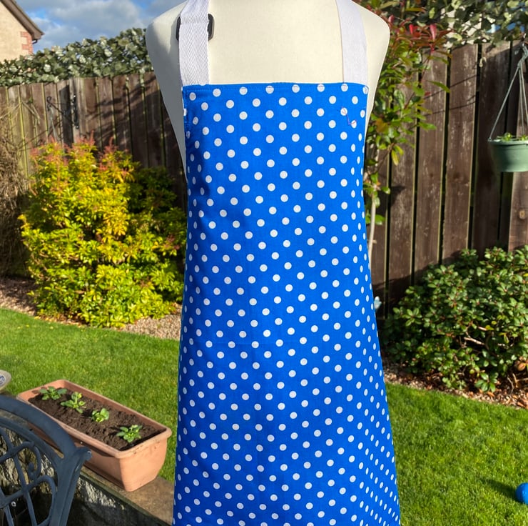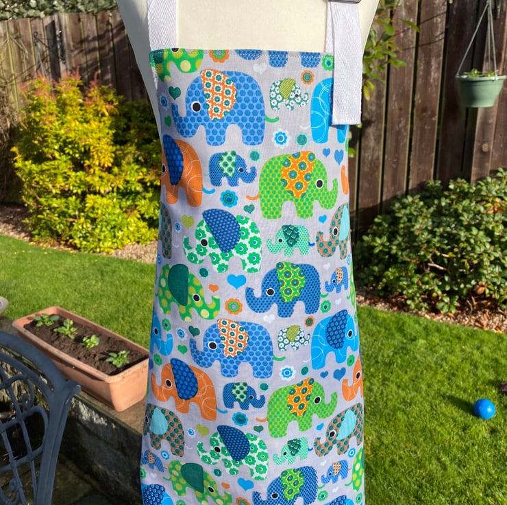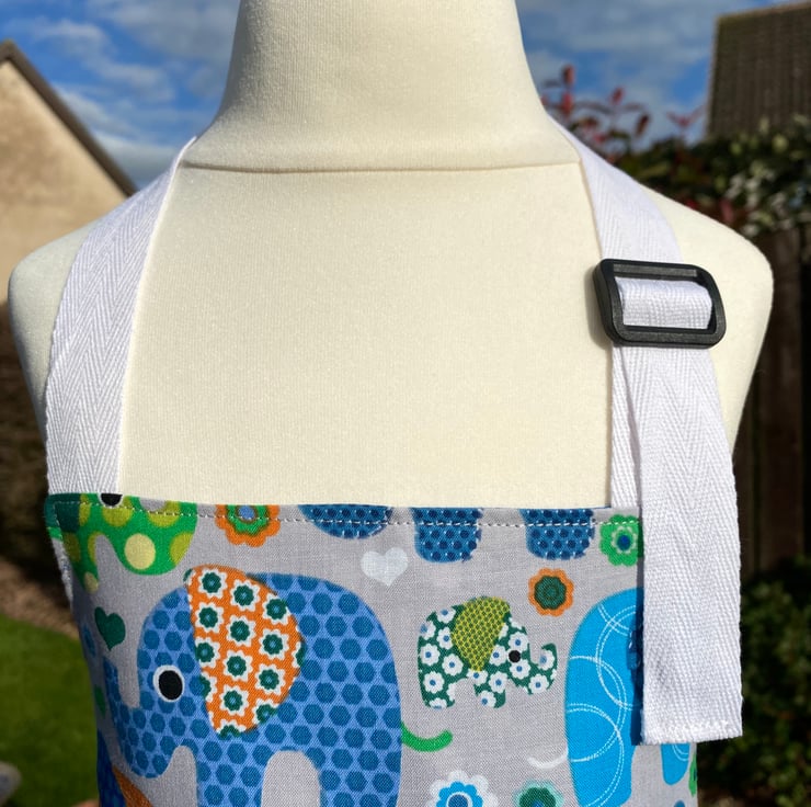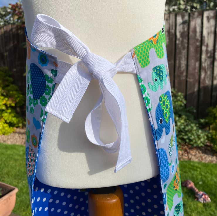 100% cotton fabrics and soft cotton ties have been used to make this child’s reversible apron
