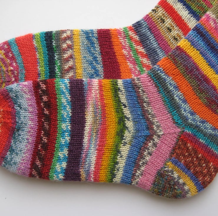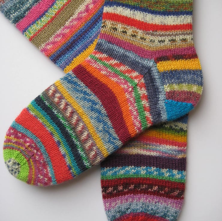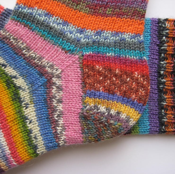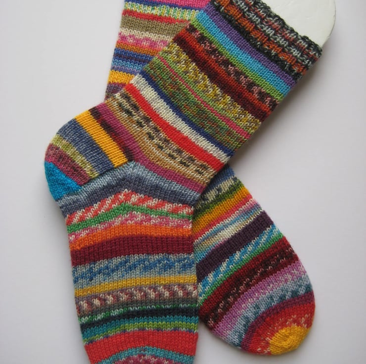 Hand knitted in the round on 5 double pointed needles, these scrappy wool socks are made from many different 4 ply self patterning sock yarns (75% wool 25% polyamide), in just about every colour you can think of! Made from very fine yarn, they are not thick and will fit most footwear. Warm and durable, these socks will keep your feet comfortable and bright throughout the year. A truly unique pair of socks that will cheer up any feet!