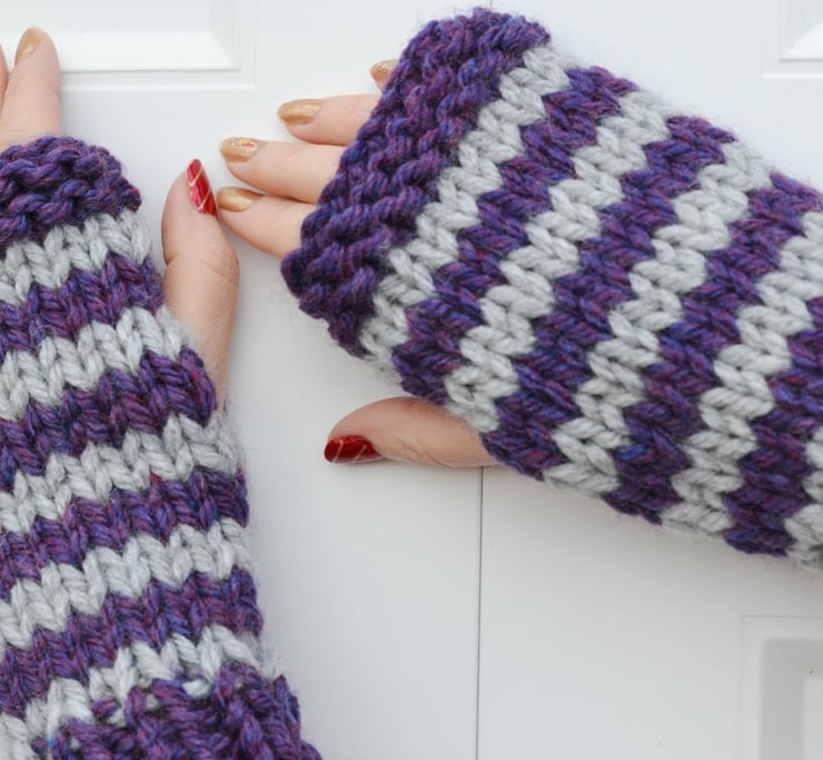 Hand knitted super chunky soft fingerless gloves. Knitted in grey and a purple which has subtle blue and red undertones to the wool as shown in the photo's with a knitted ribbed cuff. Fits small/medium sized hands only. Lots more colours in my shop.