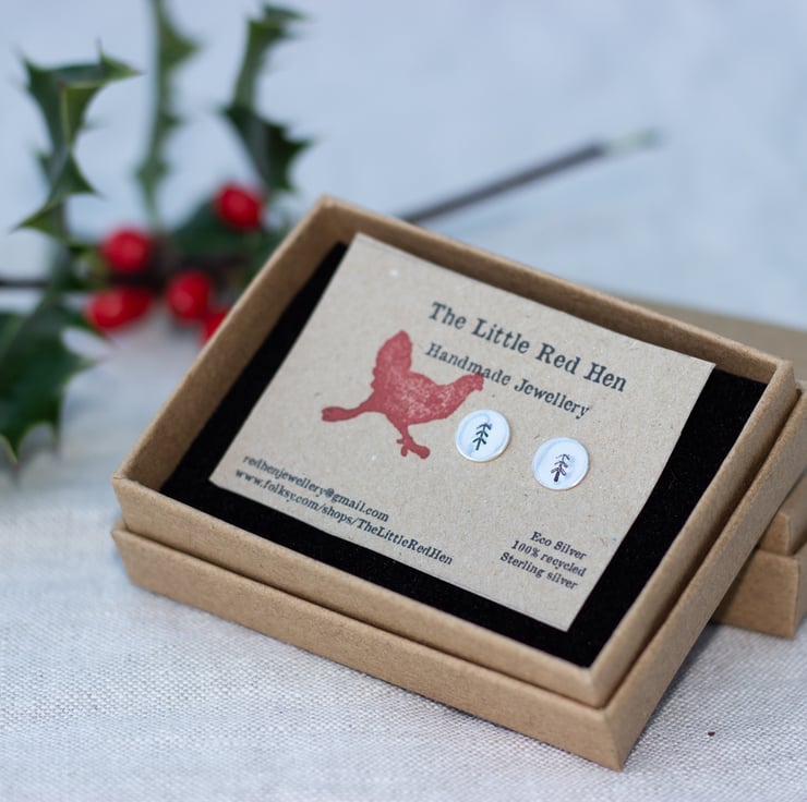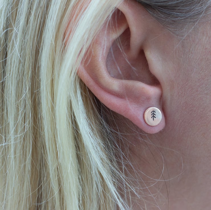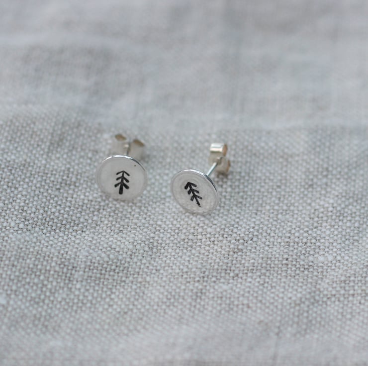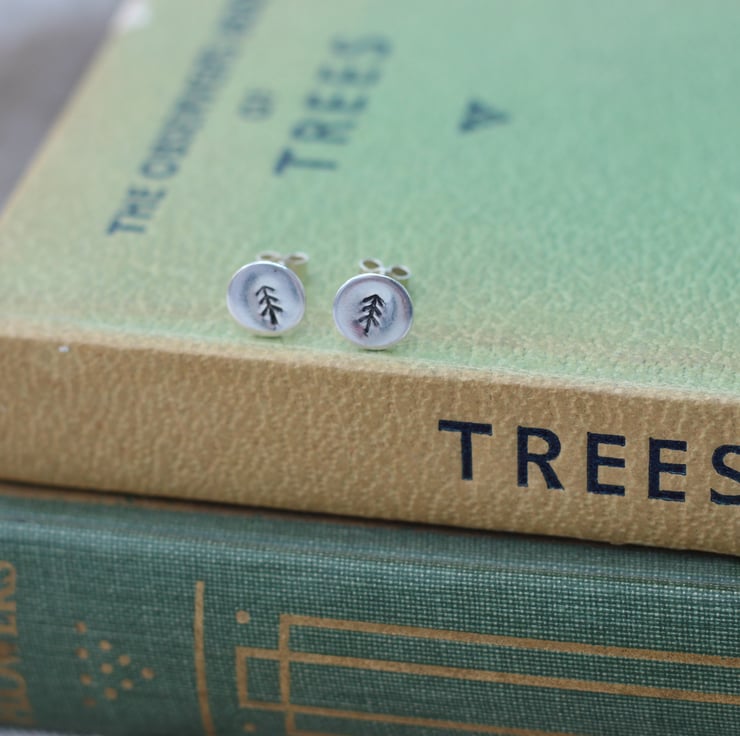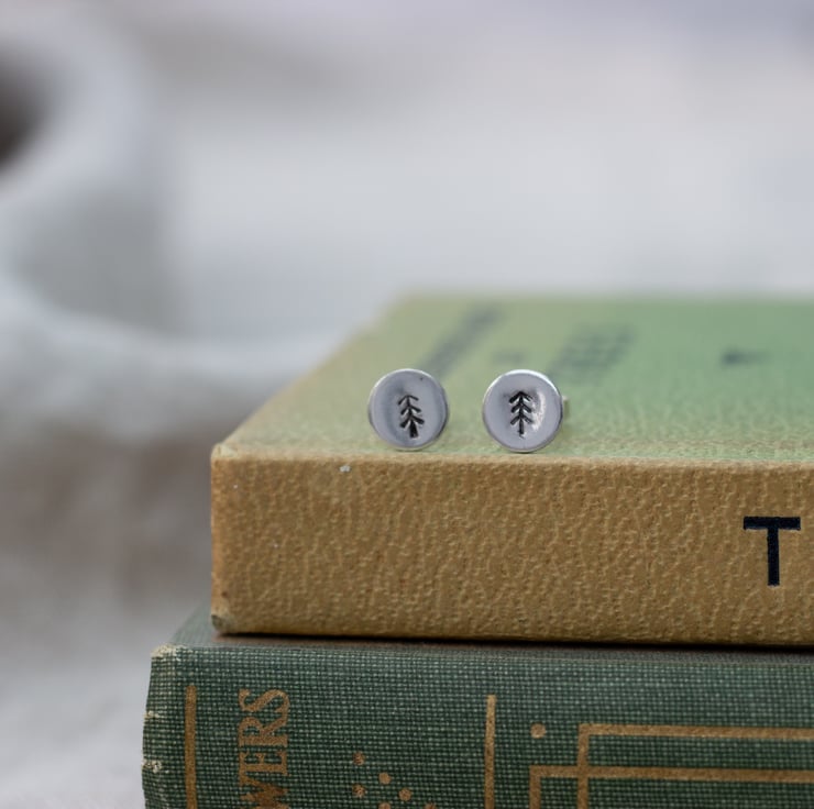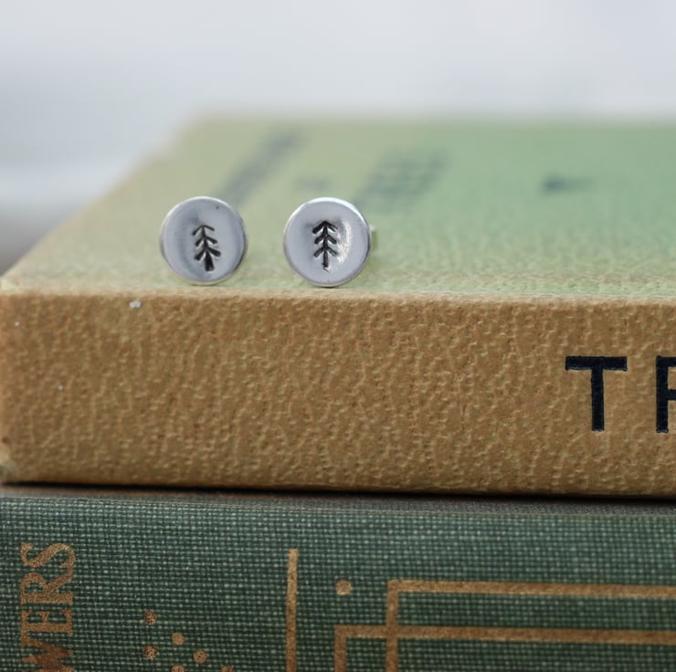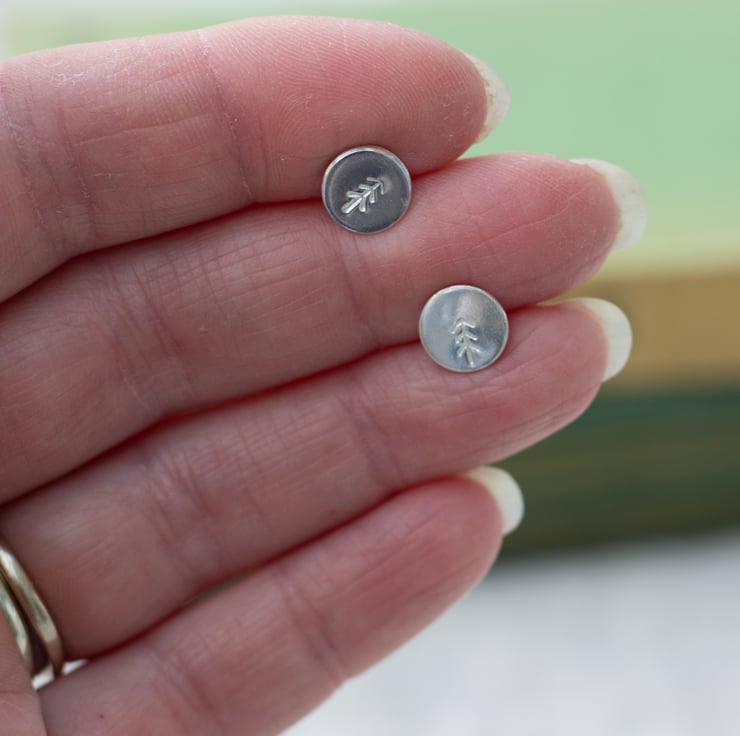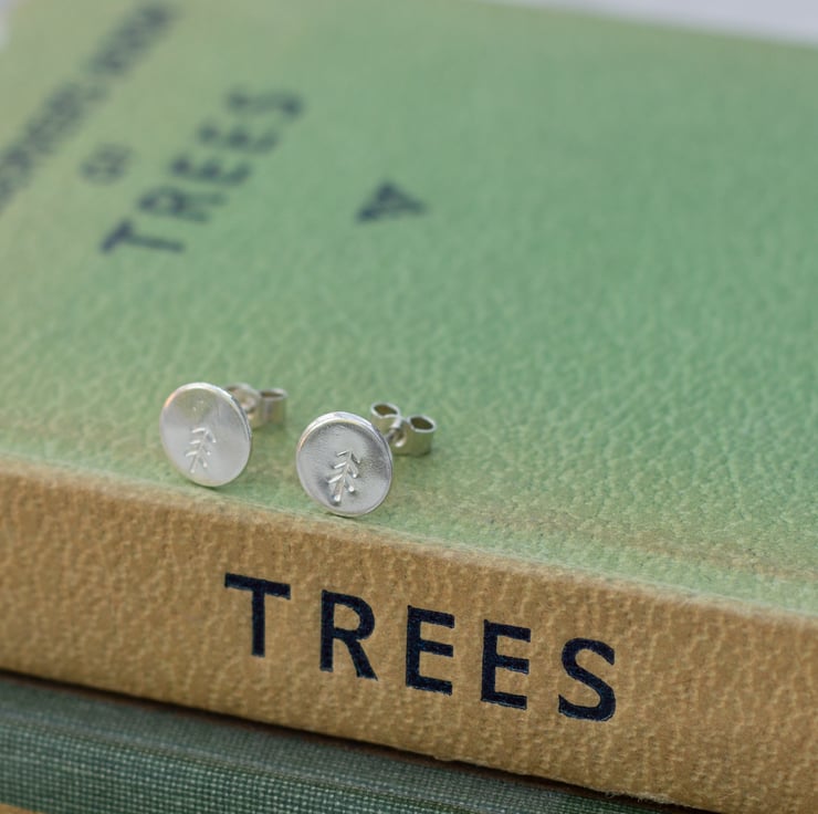 These cute studs are handmade from recycled Sterling silver sheet. A tree motif is then stamped onto the circle of silver.
