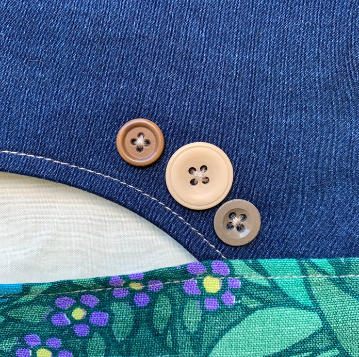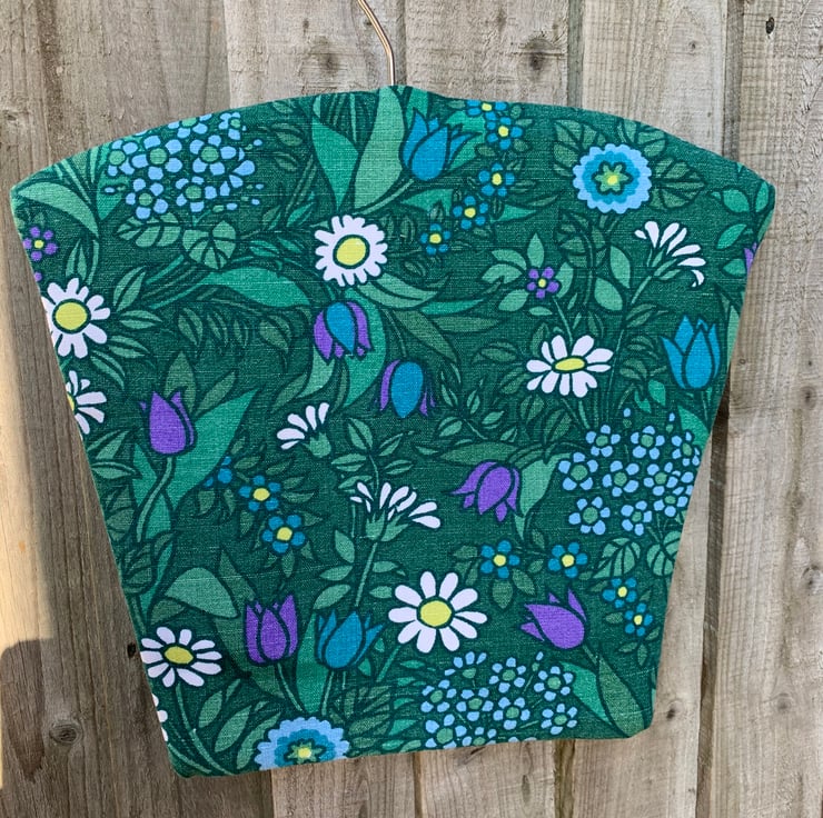 Pretty peg bag in vintage Jonelle Flower Waltz cotton designed in the sixties by Pat Albeck. This pretty floral fabric was reclaimed from a tablecloth. It’s combined with factory waste denim, which was destined for landfill. The peg bag is fully lined in cream cotton and trimmed with 3 old buttons.