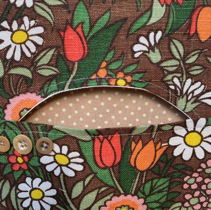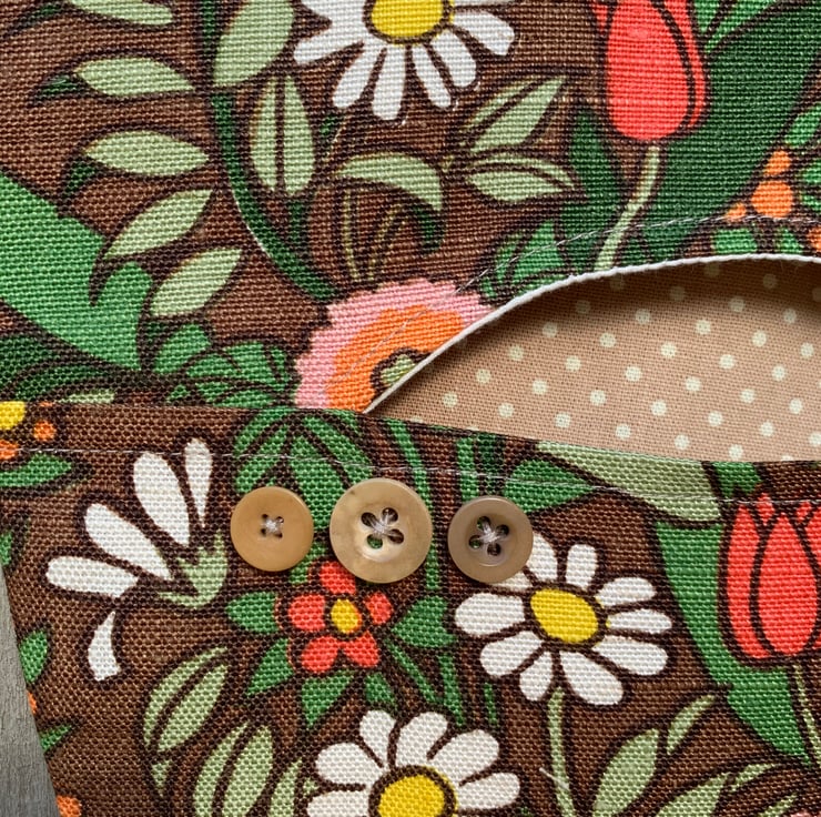 Pretty peg bag in vintage Jonelle Flower Waltz designed in the sixties by Pat Albeck. The peg bag is fully lined in spotty cotton and cream cotton and trimmed with 3 old buttons.