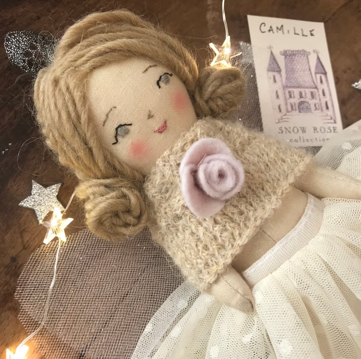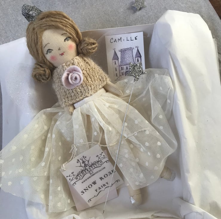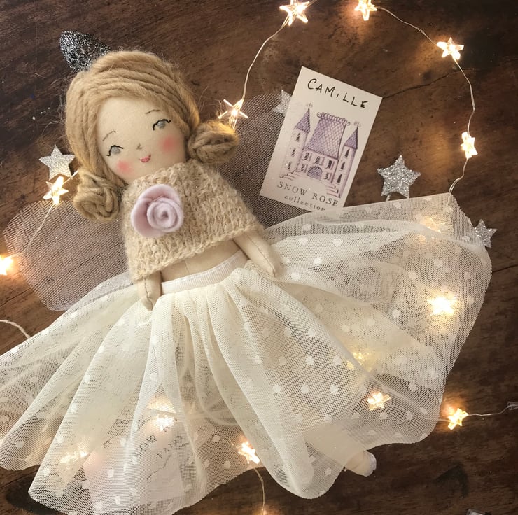 Camille is approx 10" tall and hand made by Erica-Jane Waters. She is stitched from cotton and her fairy skirt is gorgeous floaty tulle.