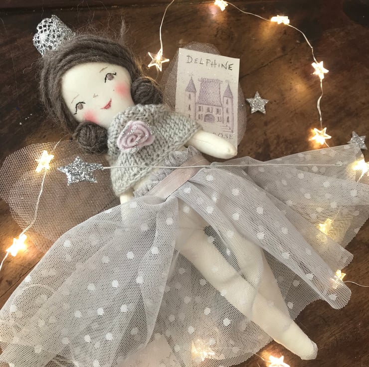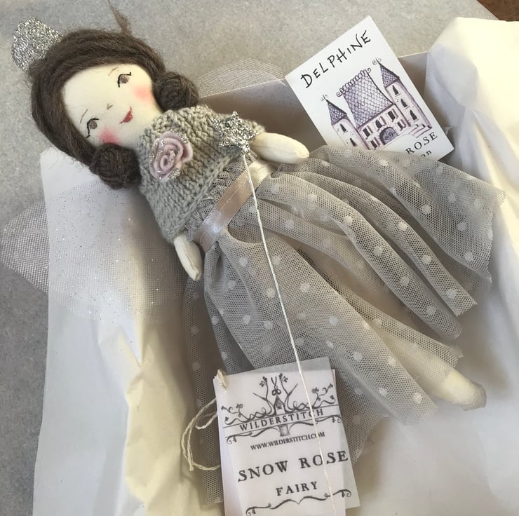 Delphine is approx 10" tall and hand made by Erica-Jane Waters. She is stitched from cotton and her fairy skirt is gorgeous floaty tulle.