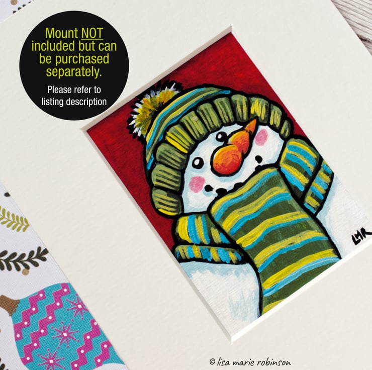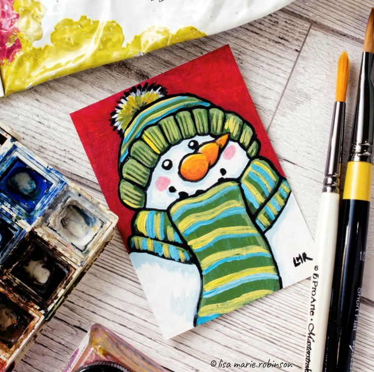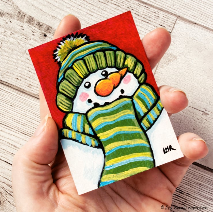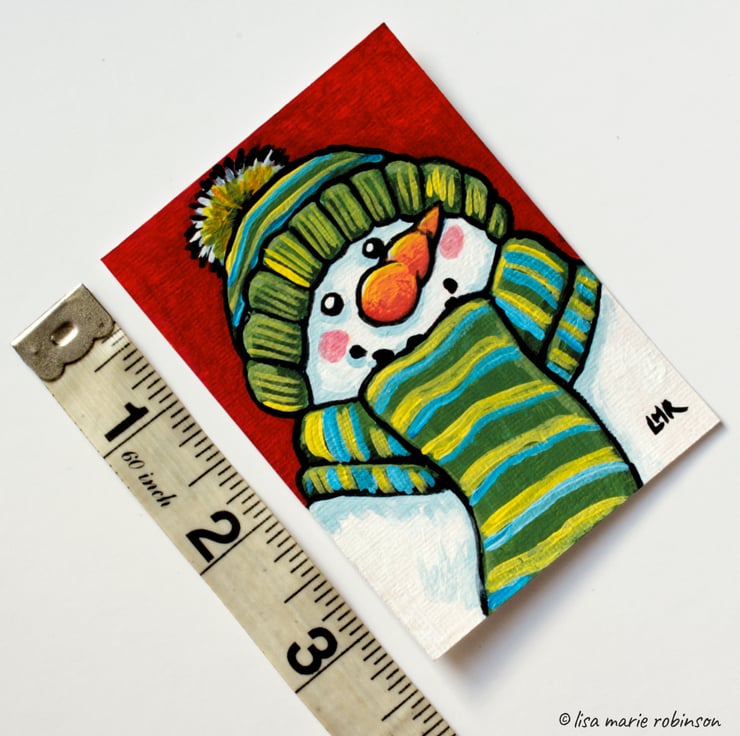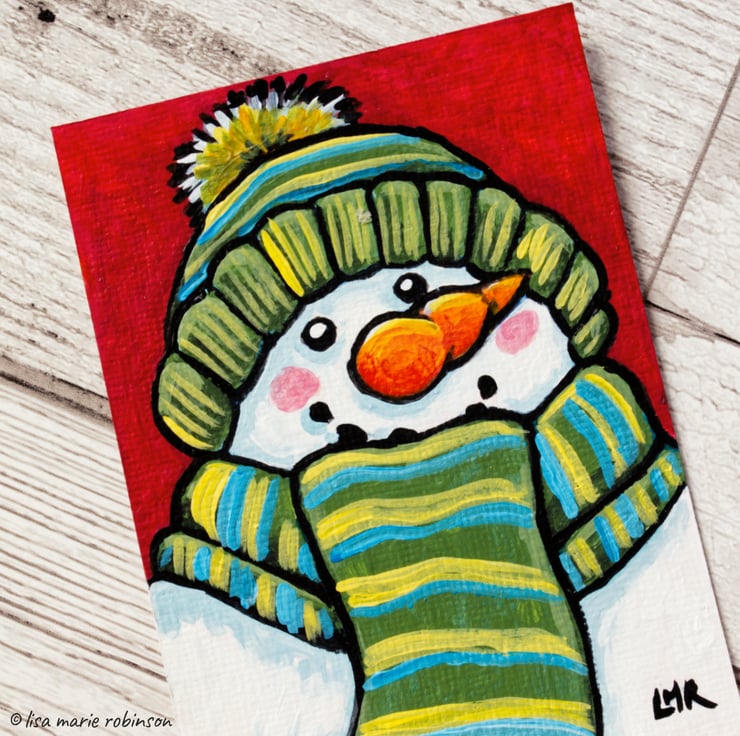 Original ACEO painting of a snowman wearing a scarf and hat. Mr Snowman has coal for his eyes, and smile, and an orange carrot nose. The scarf and hat have green, blue and yellow stripes.