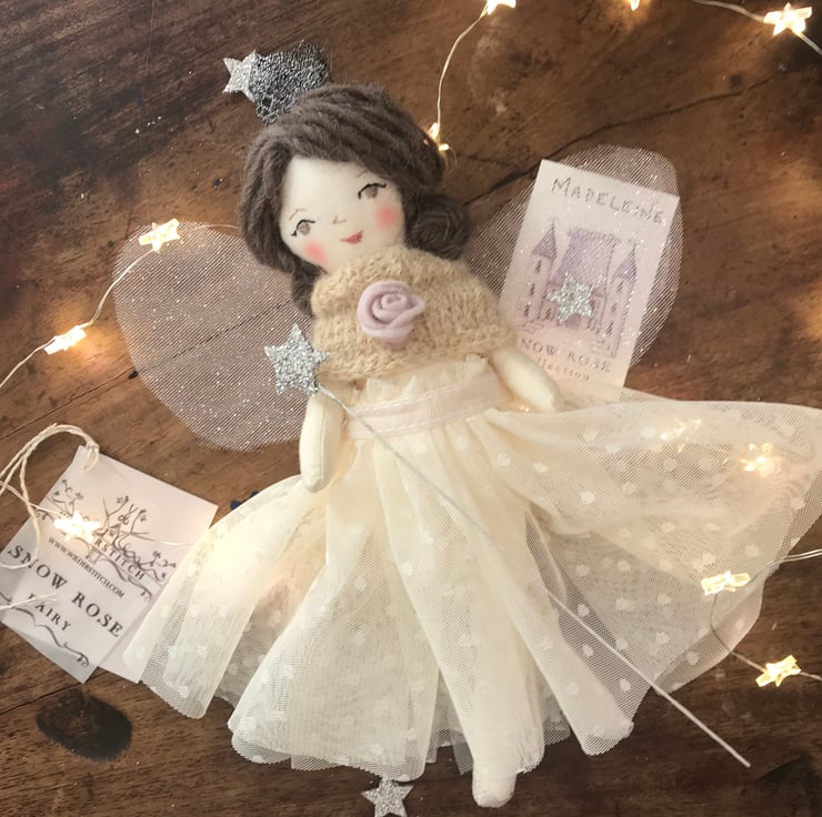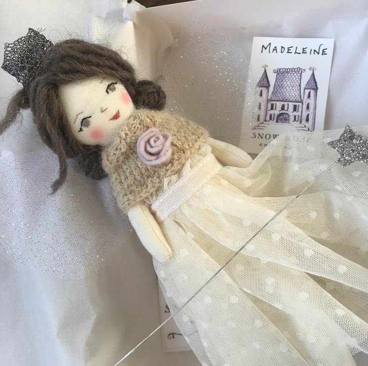 Madeleine is approx 10" tall and hand made by Erica-Jane Waters. She is stitched from cotton and her fairy skirt is gorgeous floaty tulle.