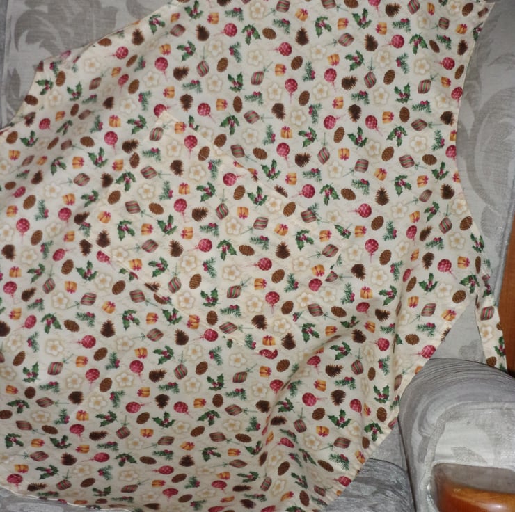 Perfect for use during the festive season, this apron is made from 100% American cotton and features a design of small baubles and holly on a cream Background. There is also a pocket on the front.