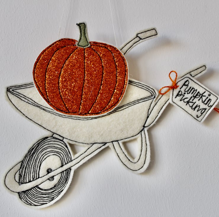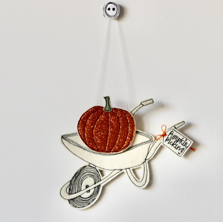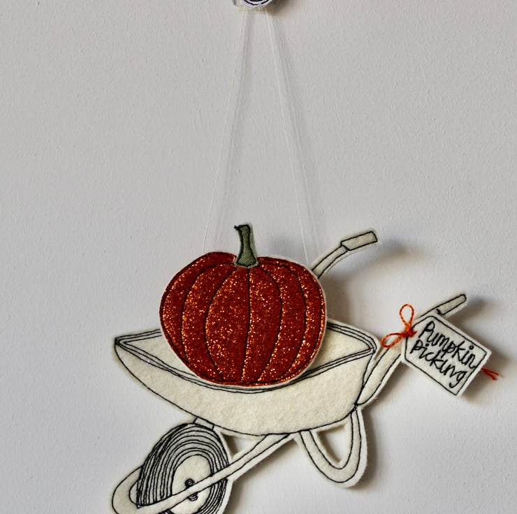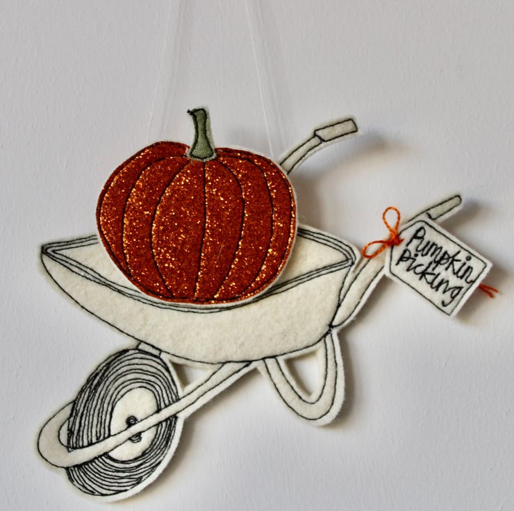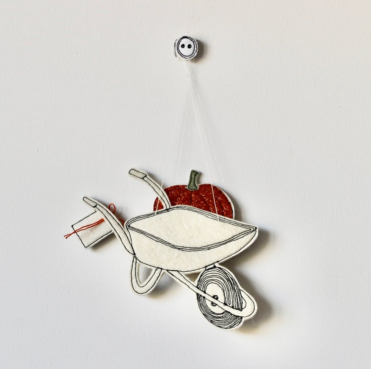 'Pumpkin picking' wheelbarrow is sewn using 100% wool felt, glitter fabric and free hand machine embroidery; multiple layers of cloth are sewn together and cut out by hand using very sharp scissors. With a linen string to suspend.