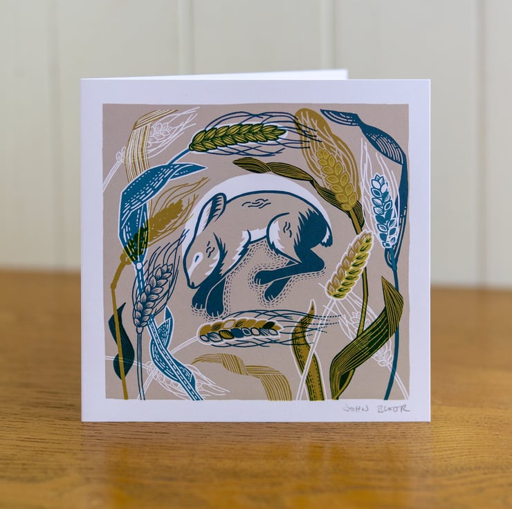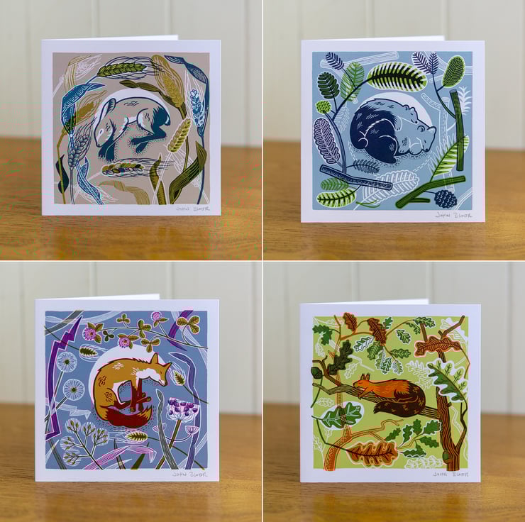 All four Sleeping Animals cards, printed onto nice uncoated card with a Kraft envelope. Size 148x148mm. You will receive one each of Fox, Hare, Squirrel and Bears cards.