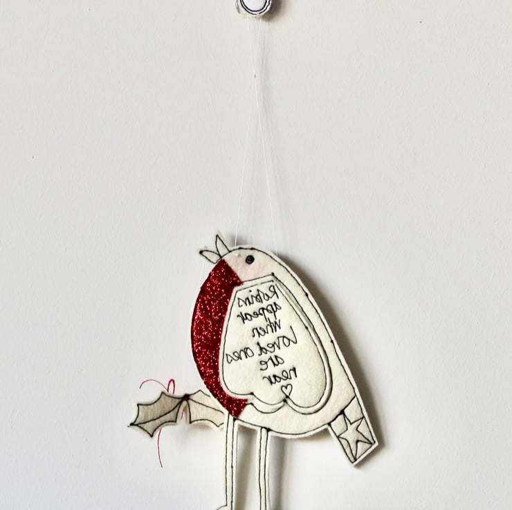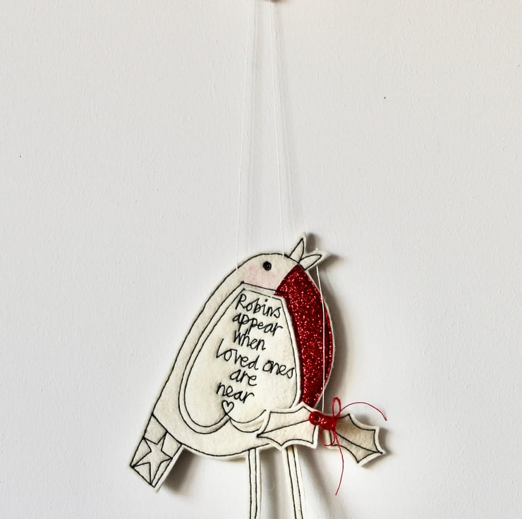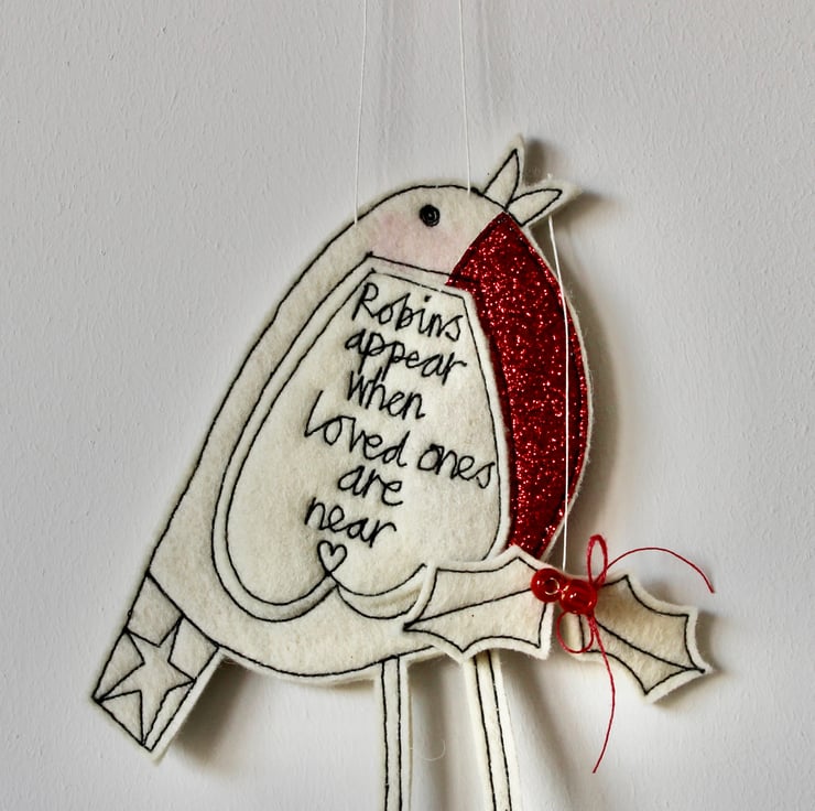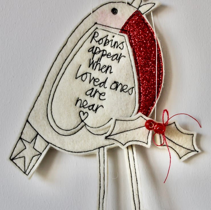 With a red glittery breast, Mr Robin has holly suspended from his beak and the sentiment 'Robins Appear when Loved Ones are Near' sewn on his wing.