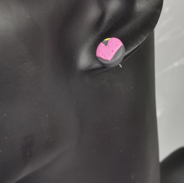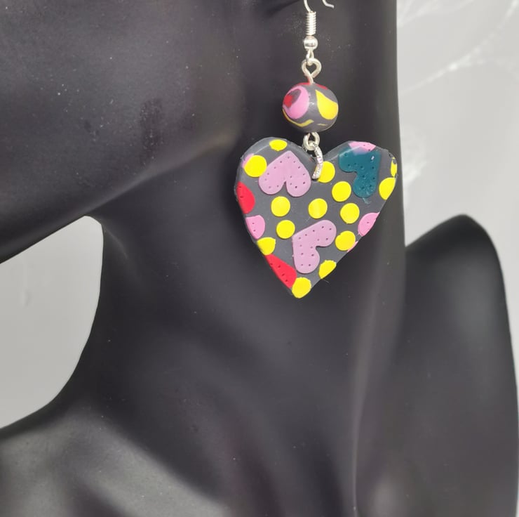 Singular heart, drop earrings. Multicoloured heart and spot design on black background.