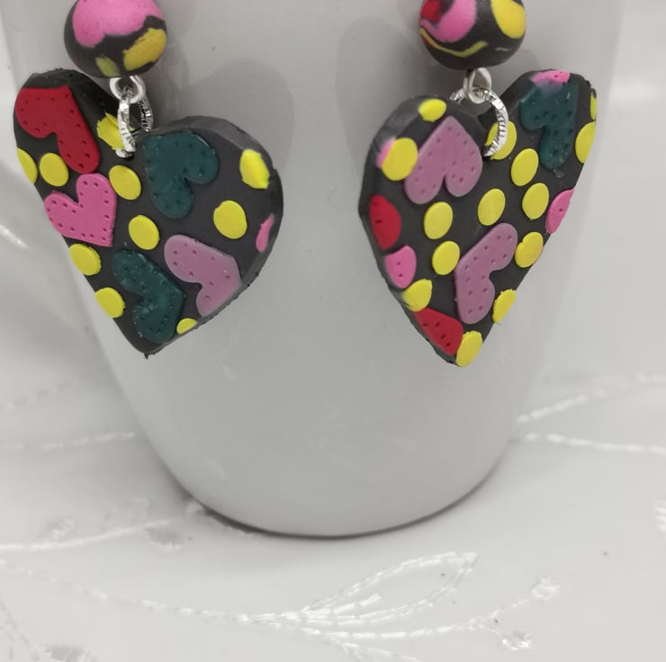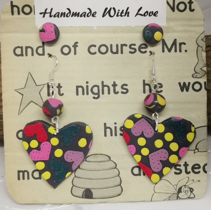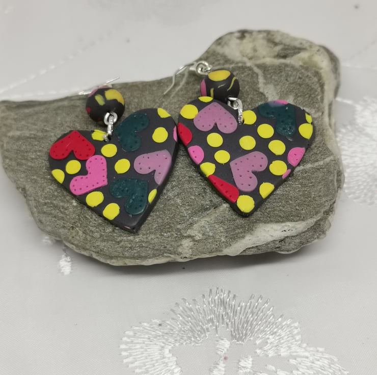 I love playing with polymer clay, trying out different colours, shapes, designs. Hearts are such lovely, simple shapes that say so much. I covered a black sheet of clay with hand cut hearts and dots to create the design then cut out the large heart pendants. When finished I still had some of the design sheet left so decided to cut out small circles and make some studs. When finished there was still some clay left, so I made some beads to complement the set. Circles, hearts, orbs. Love makes the world go round