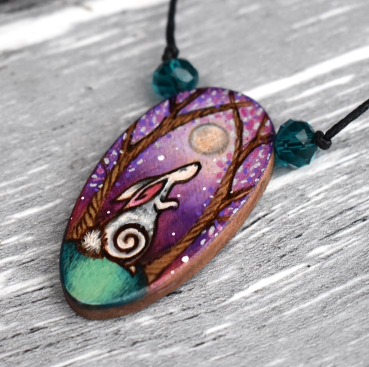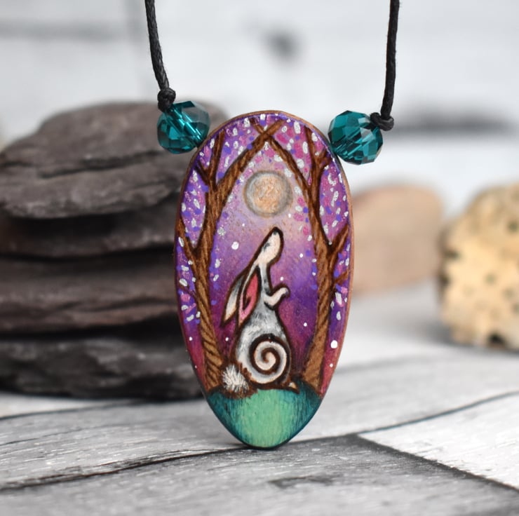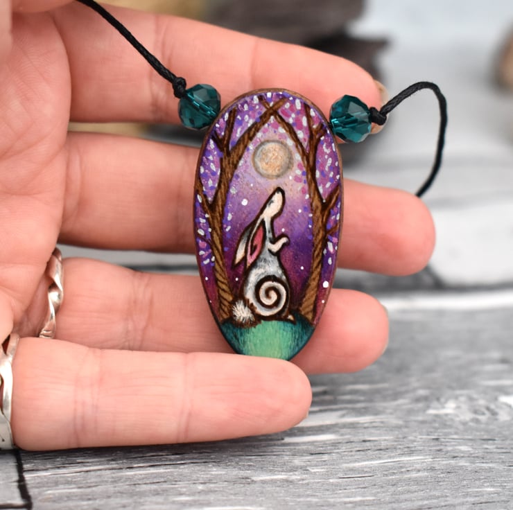 A hand burned oval pendant featuring a moon gazing hare surrounded by trees. It fits the shape of the oval pendant, with a starry night background using purple hues. The design was created using pyrography and then coloured using art pencils and paint.