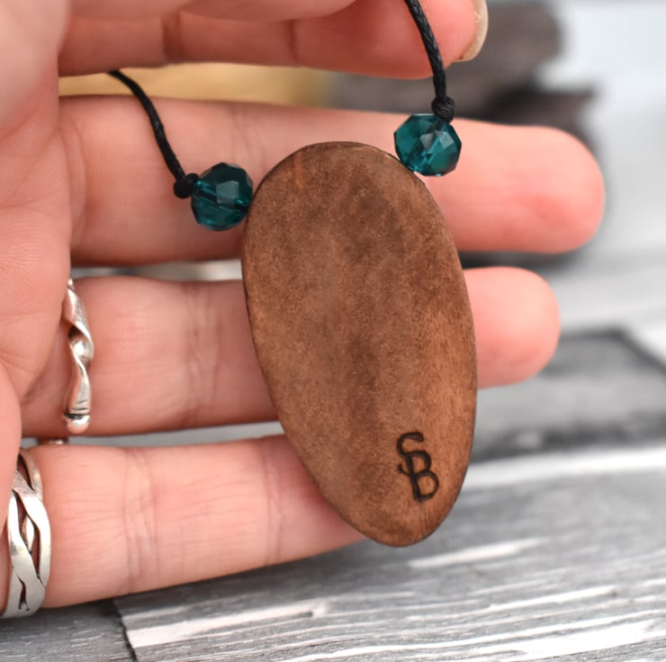 -The pendant is a wooden oval shape.