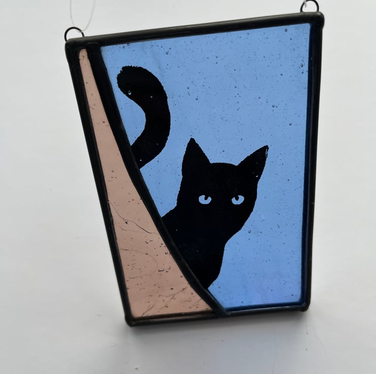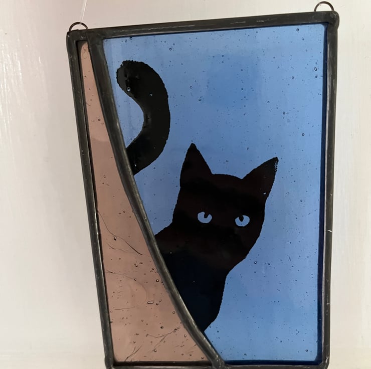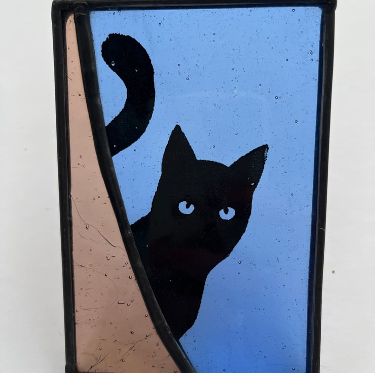 A beautiful blue and purple cat themed panel made using the Tiffany (copper foiled) method of stained glass. This piece features the silhouette of a peeping cat, screen printed in black enamel. The lead came edging has been patinated to give a black finish, and a clear nylon hanging thread is attached.