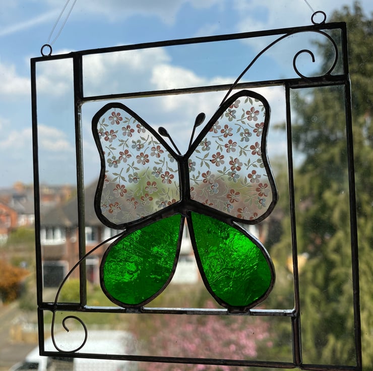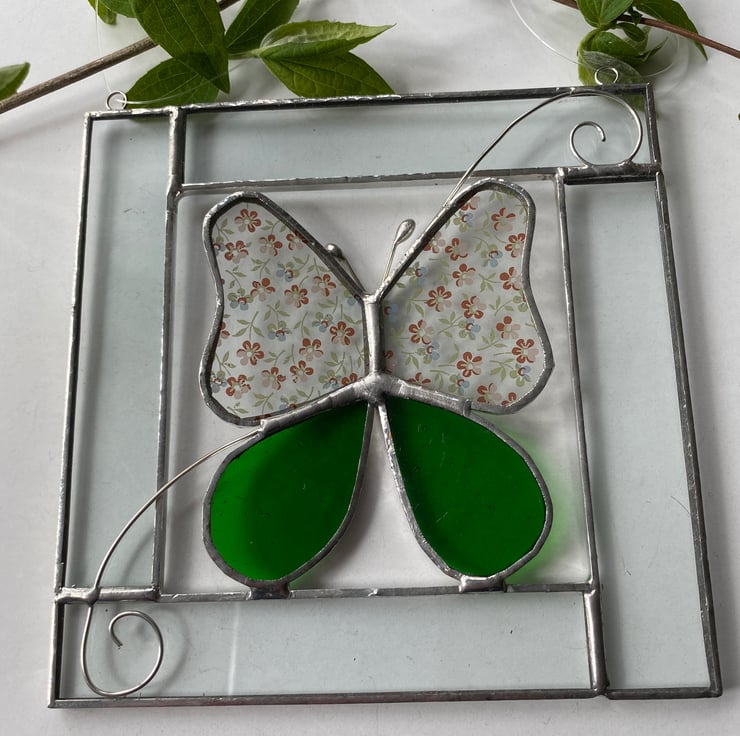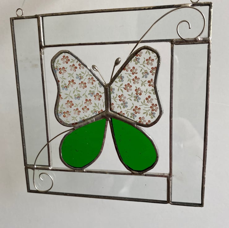An elegant 4-piece butterfly made using the Tiffany (copper foiled) method of stained glass. The top of the butterfly's wings are created from clear, floral pattered glass, and the lower sections from a bold green glass. It is framed in a clear glass square made up of 4 rectangular pieces, and features 2 wire curls at the top and bottom. The butterfly's wings angle forward, giving it a beautiful 3D effect when the light catches it.