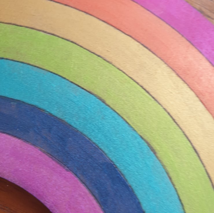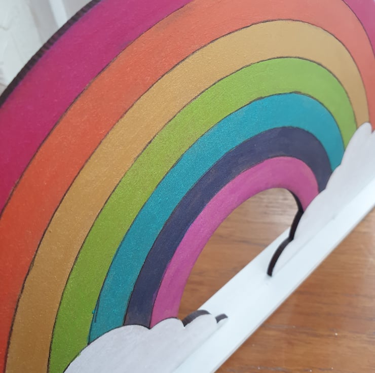 Beautiful mdf rainbow painted in shimmer paints. This rainbow stands about 15cms high and is 30cm long. Beautiful for standing in the window or shelf