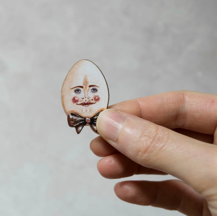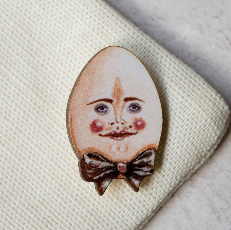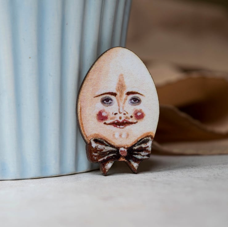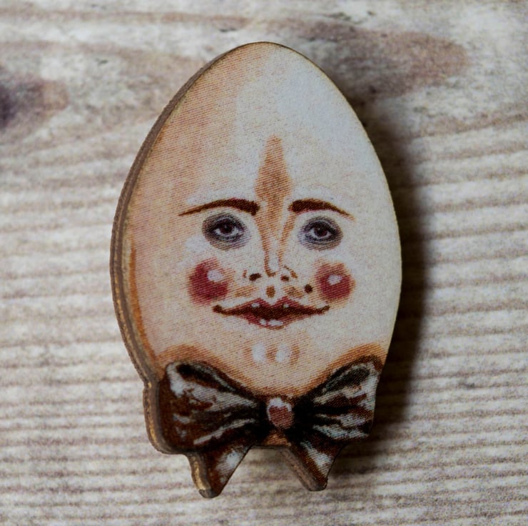 The eggman has been coated with a gloss coating to enhance his beauty! The reverse features a brooch bar pin so that you can pin him onto your clothing.