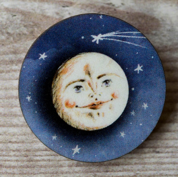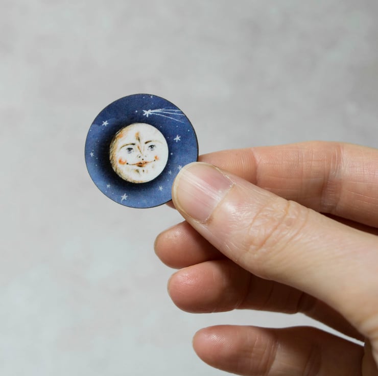 The magical moon brooch has been coated with a gloss coating to enhance its beauty! The reverse features a brooch bar pin so that you can pin the moon onto your clothing for all to admire.