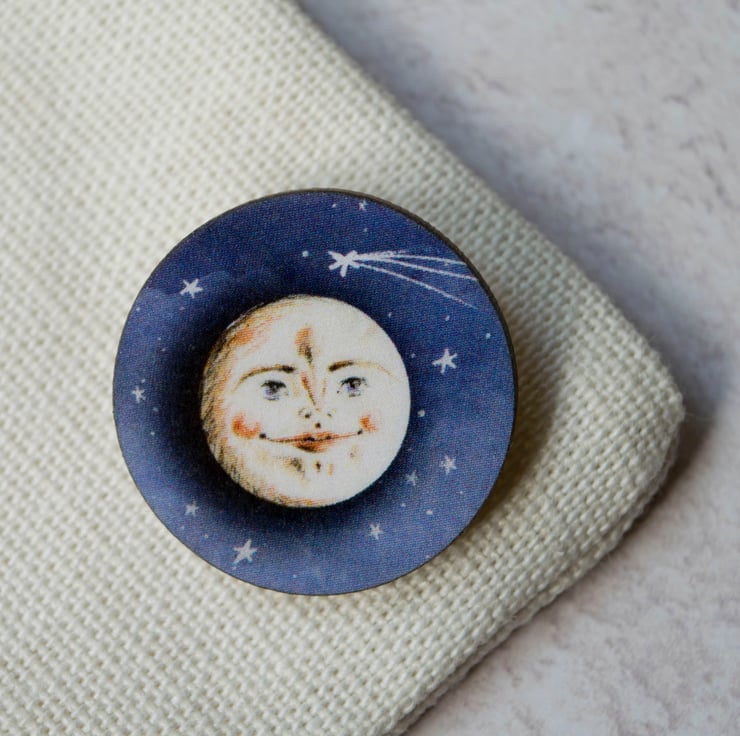 A wooden laser cut brooch/ badge featuring my illustration of a smiling full moon.