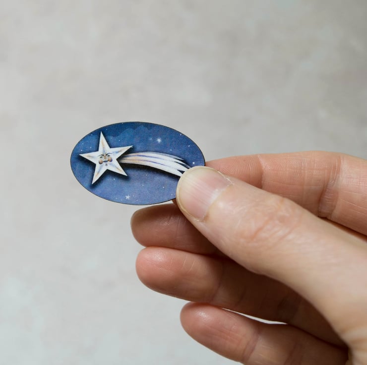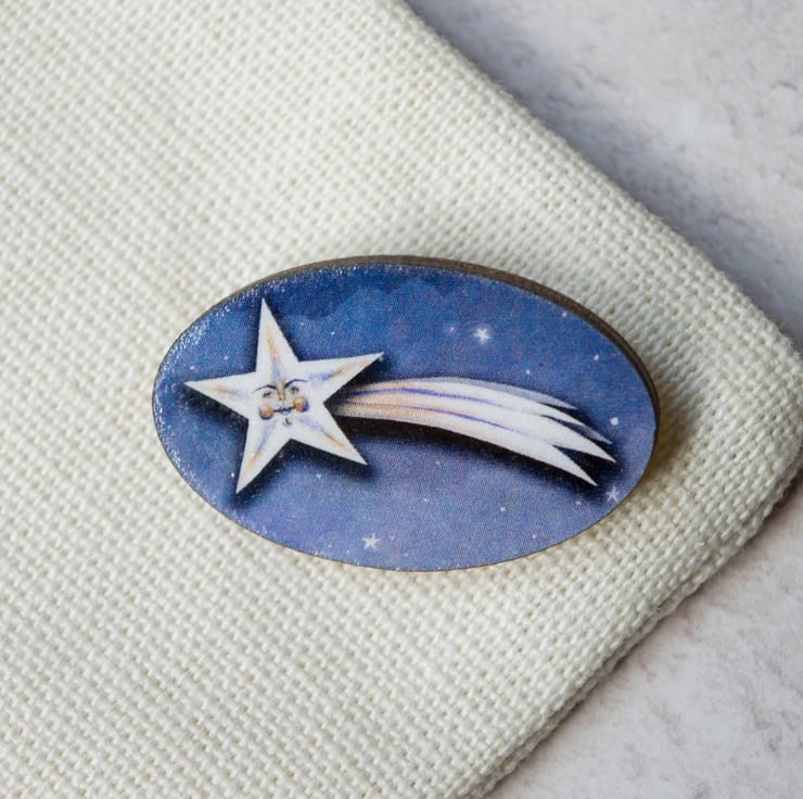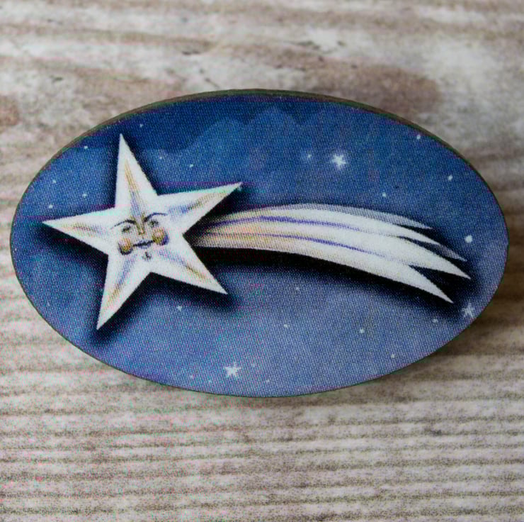 A charming wooden laser cut brooch/ badge featuring my illustration of a shooting star named David.