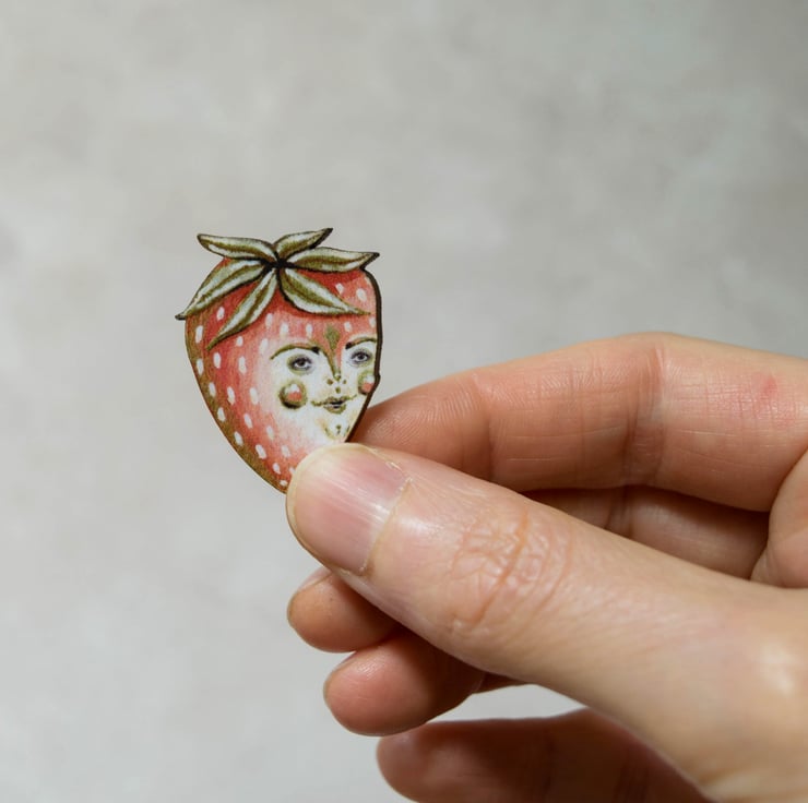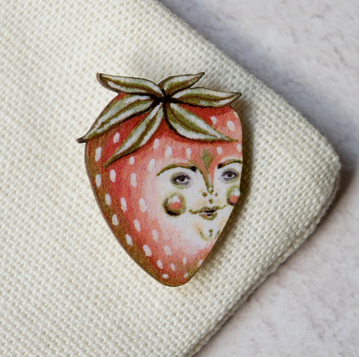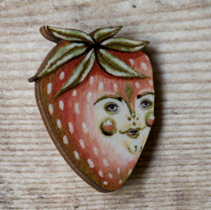 A quirky wooden laser cut badge/ brooch featuring my illustration of Sam the strawberry. Sam also features on a greeting card within my shop.
