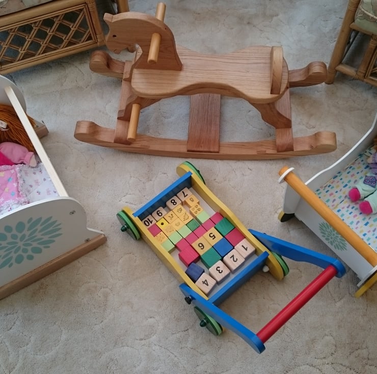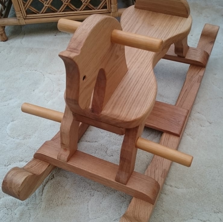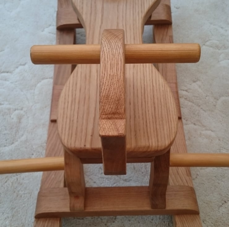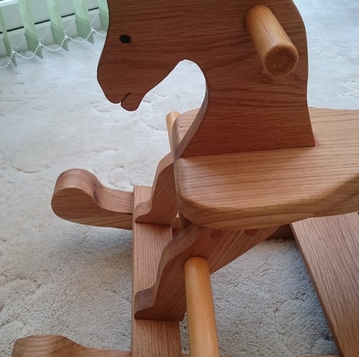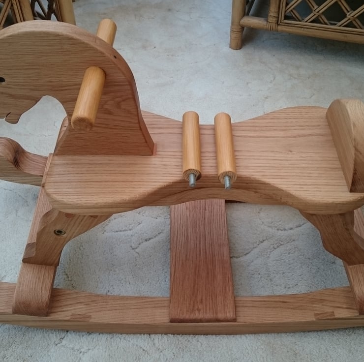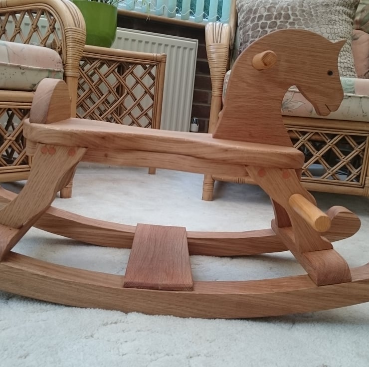 This all wooden Rocking Horse was handmade to the highest quality and completed entirely in Solid Oak which not only looks stunning but is guaranteed to last for years. this beautiful Oak wood has been preserved with several coats of Danish Oil and polished to a semi-gloss. Knowing how quickly children grow the foot rests can be unscrewed to allow the feet to reach the bottom rail. If you are looking for the Classic Rocking Horse made to the highest standard this is the perfect Christmas Present.