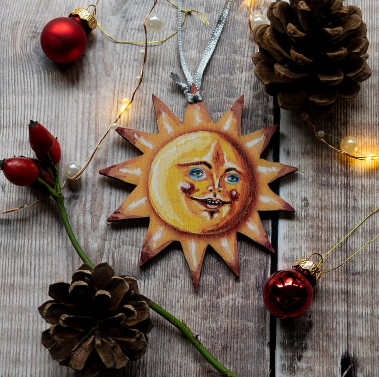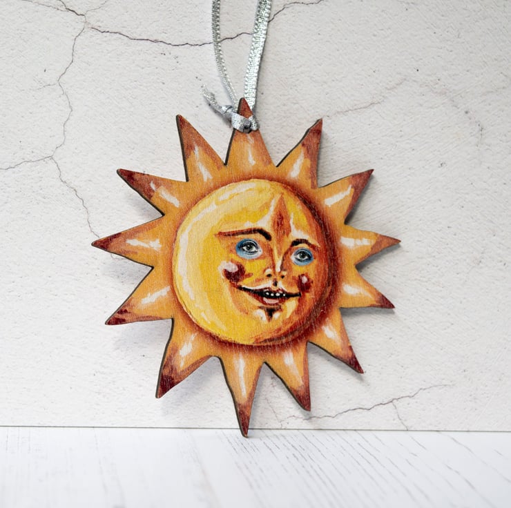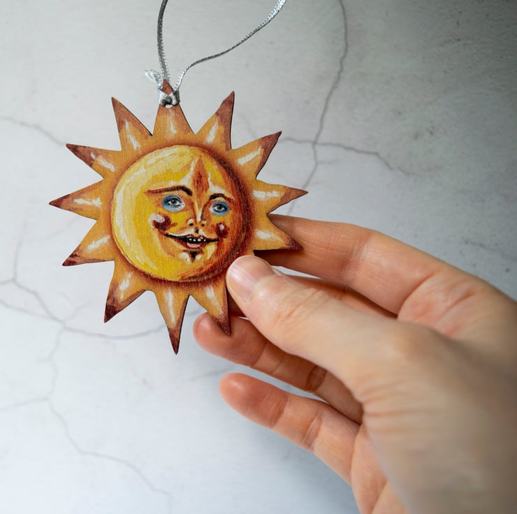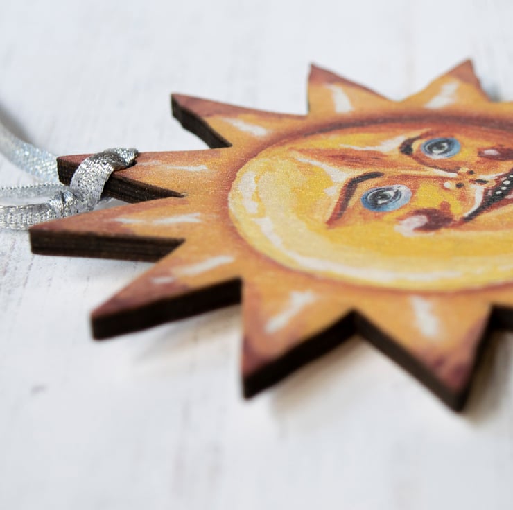 The sun has been made from a premium grade wood which has been UV printed with my design and then laser cut within the UK. The grain of the wood is visible through the print, which is very different to my usual wooden hanging decorations, so there may be a slight difference from that pictured.