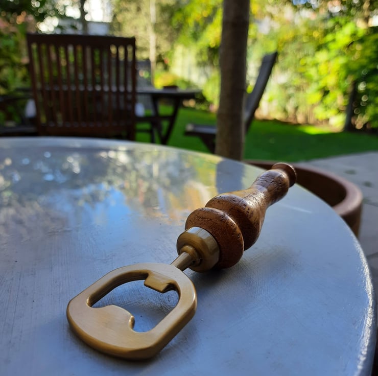 This is a handmade, woodturned bottle opener, made using exotic hardwoods Mango and Cherry. The handle tapers down to a narrow point with some unusual curves that make it interesting and tactile to hold. The hardware has an "antique gold" coloured finish.