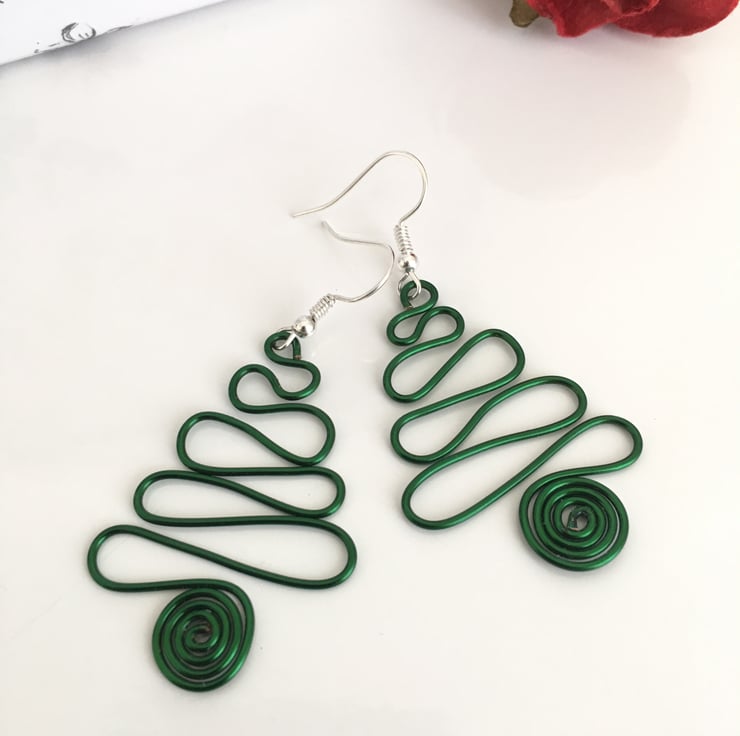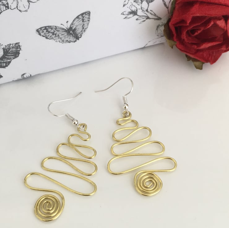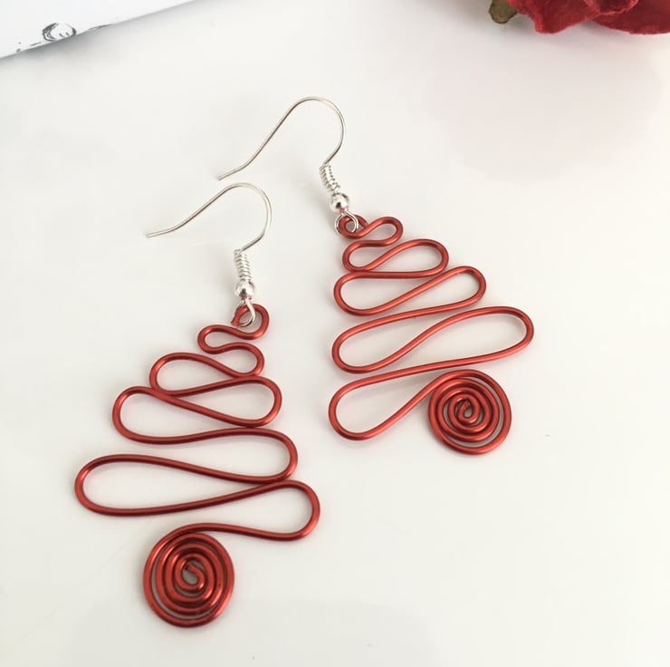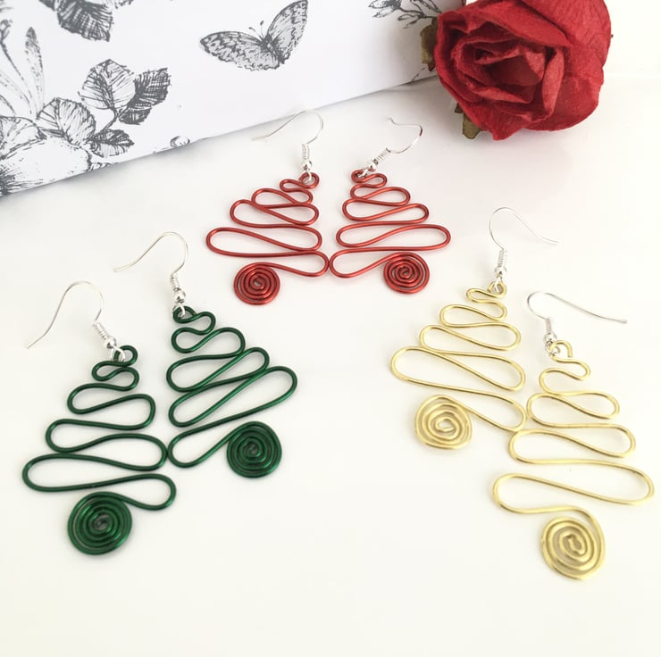 Handmade from coloured copper wire in the tradition christmas colours of red, green, and gold, the earrings are shaped into a swirly christmas tree design. The drop dangles are approximately 4cm in length, and are slightly hammered to harden the metal.