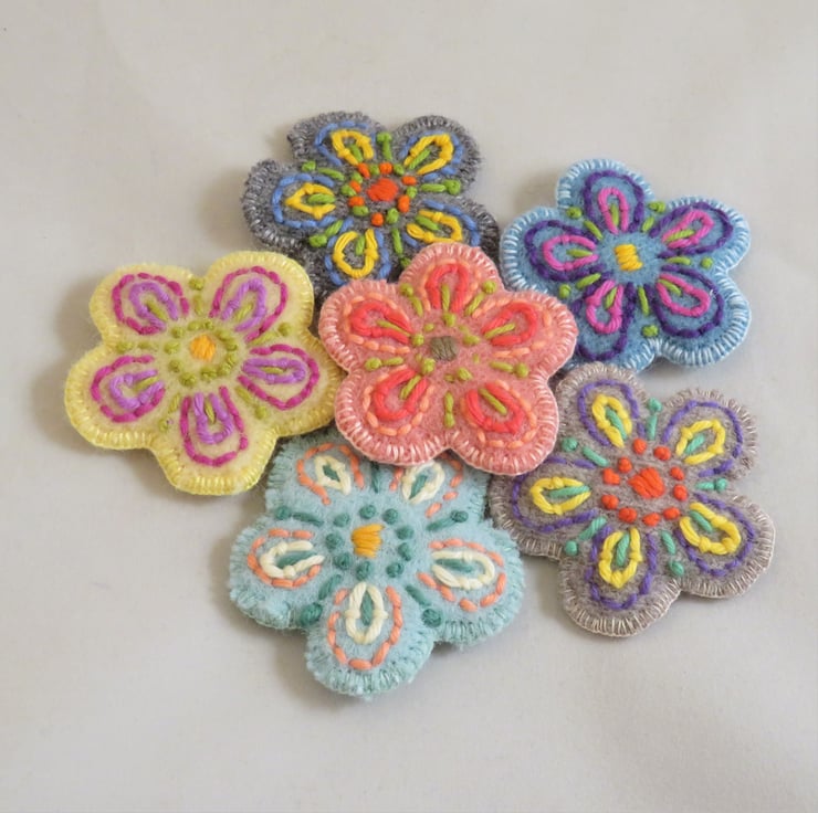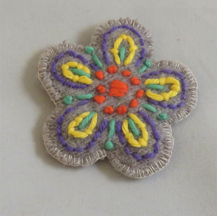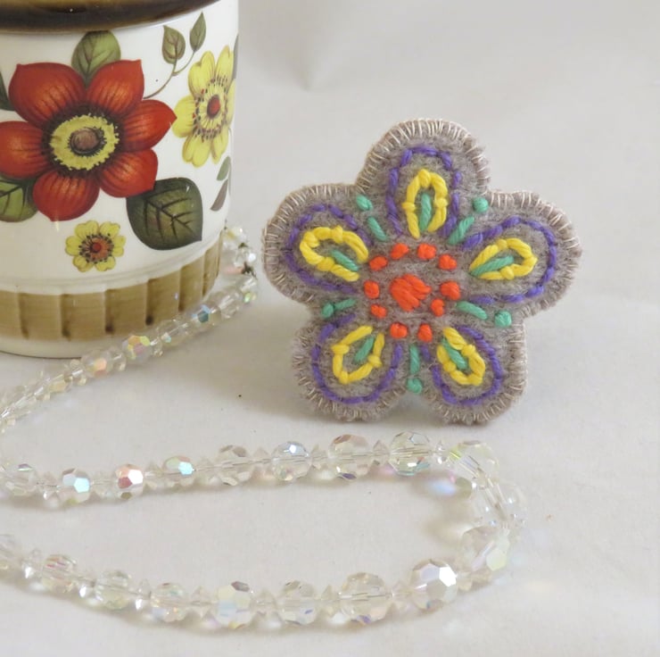 A pretty brooch featuring a retro inspired, flower design hand embroidered in cotton thread onto a recycled wool background.