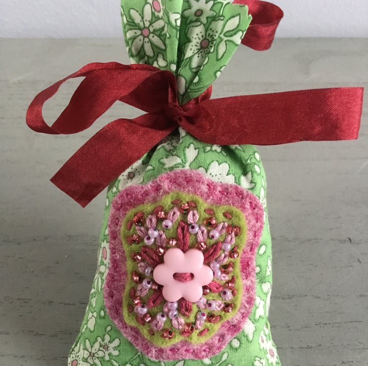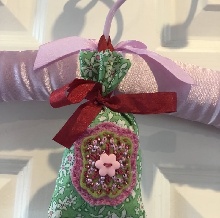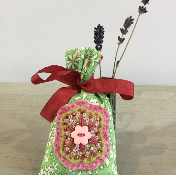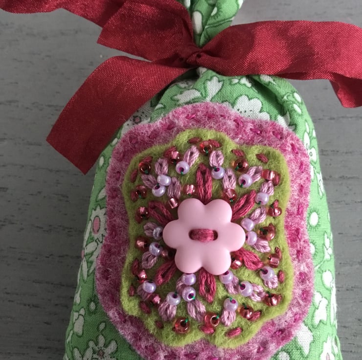 A small pink button is at the centre of the hand embroidery on this lavender bag, with embroidered stitches and seed beads in rose pink and ruby surrounding the flower, on a background of green and rose pink felt. These colours echo the green and pink of the fine lawn cotton material the bag is made of. The lavender bag is hand tied with a ruby ribbon with a hanging loop for a coat hanger or, to hang on a door handle in the home. The lavender bag is 12 cms tall and 7 cms wide so small enough to put in a drawer or to hang up.