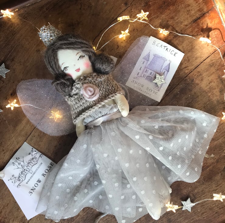 Beatrice is approx 10" tall and hand made by Erica-Jane Waters. She is stitched from cotton and her fairy skirt is gorgeous floaty tulle.